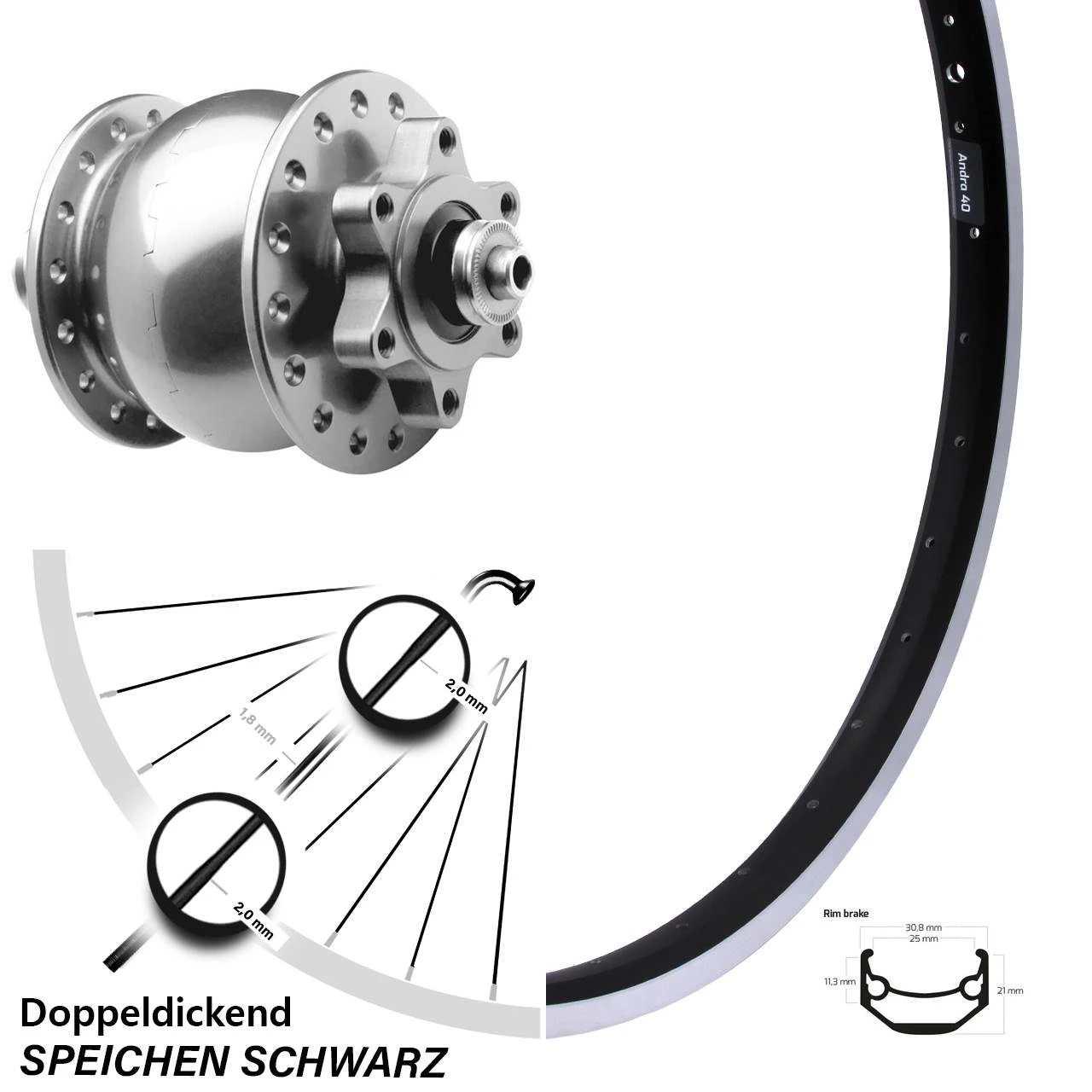 Technische Daten Vorderrad Ryde Andra 40 Felgenbremse schwarz & Nabendynamo SON 28 Disc 6-Loch Hohlachse silbern eloxiert