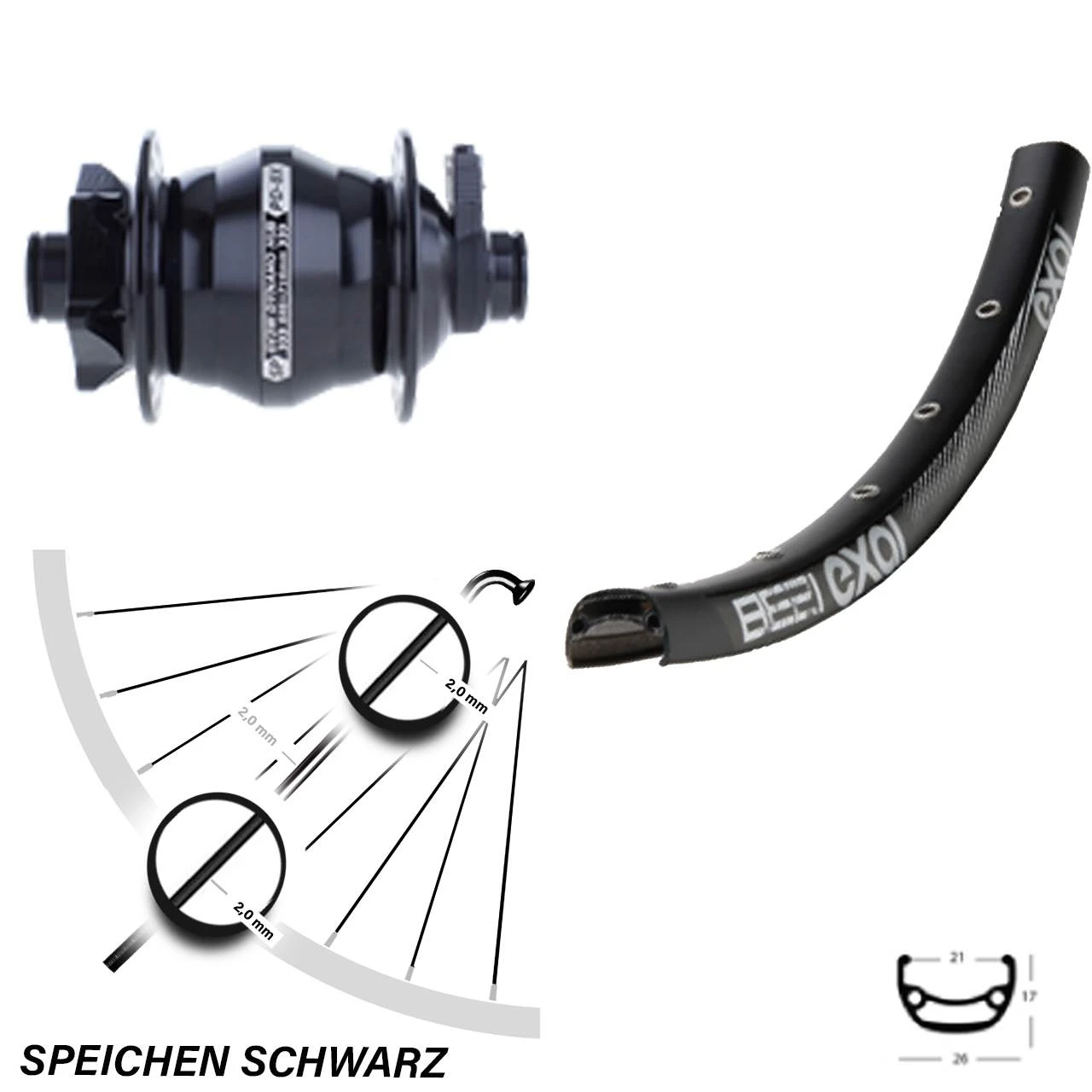 Technische Daten vorderes Laufrad Exal BE 21 schwarz & Nabendynamo Shutter Precision PD-8X-110 Disc 6-Loch Boost schwarz