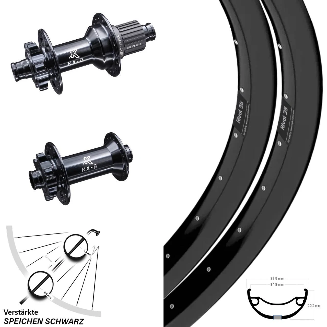 mit Reifenbreite 60-78 mm - Vorderrad-Nabe / Hinterrad-Nabe: KX-B Boost Hinterradnabe 12/148 mm 6-Loch Stahl Micro Spline,KX-B Boost Vorderradnabe Steckachse 15/110 6-Loch schwarz