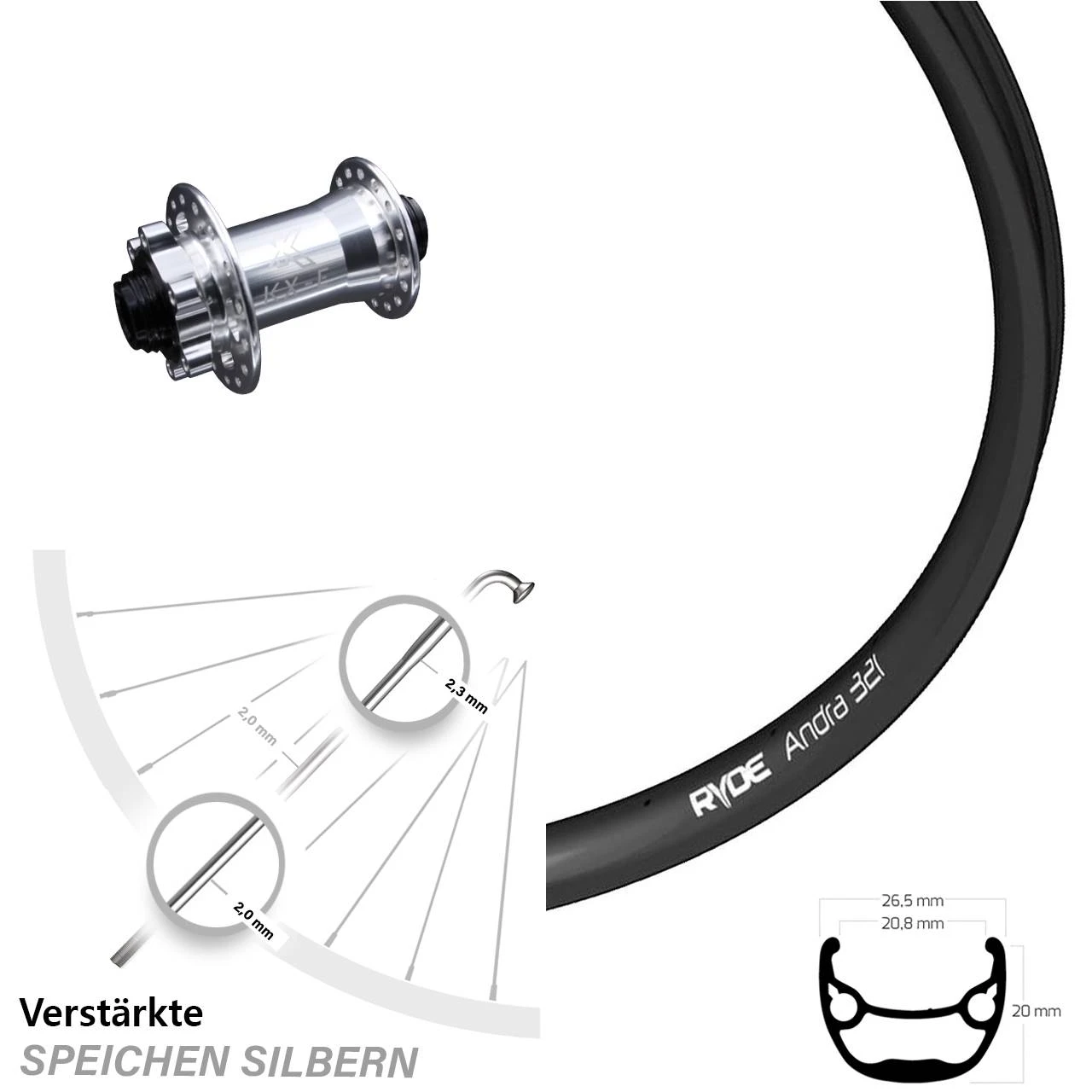Technische Daten Vorderrad Ryde Andra 321 Disc schwarz mit Nabe KX-E Vorderradnabe 6-Loch 15/100 silbern