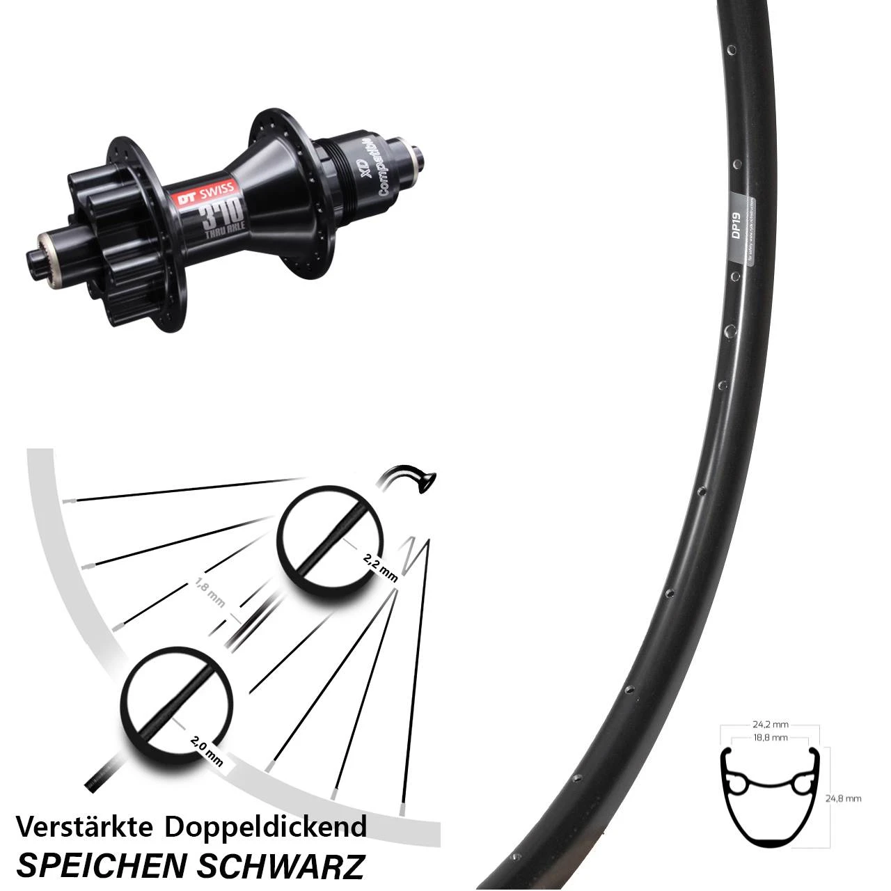 Technische Daten Hinterrad Ryde DP 19 Disc schwarz und Nabe DT Swiss 370 Disc 6-Loch SRAM XD 5/135