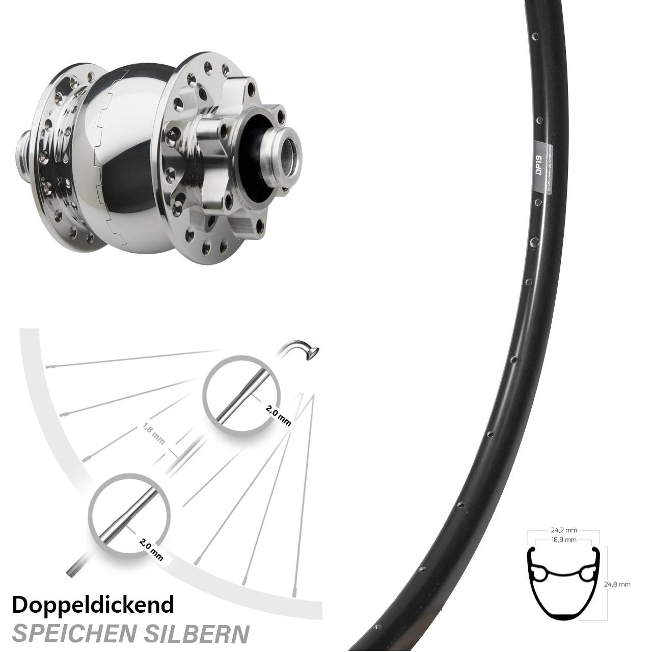 28 Zoll Ryde DP 19 Disc 6-loch Vorderrad SON 28-12 Dynamo Silbern Poliert 12/100 Mm