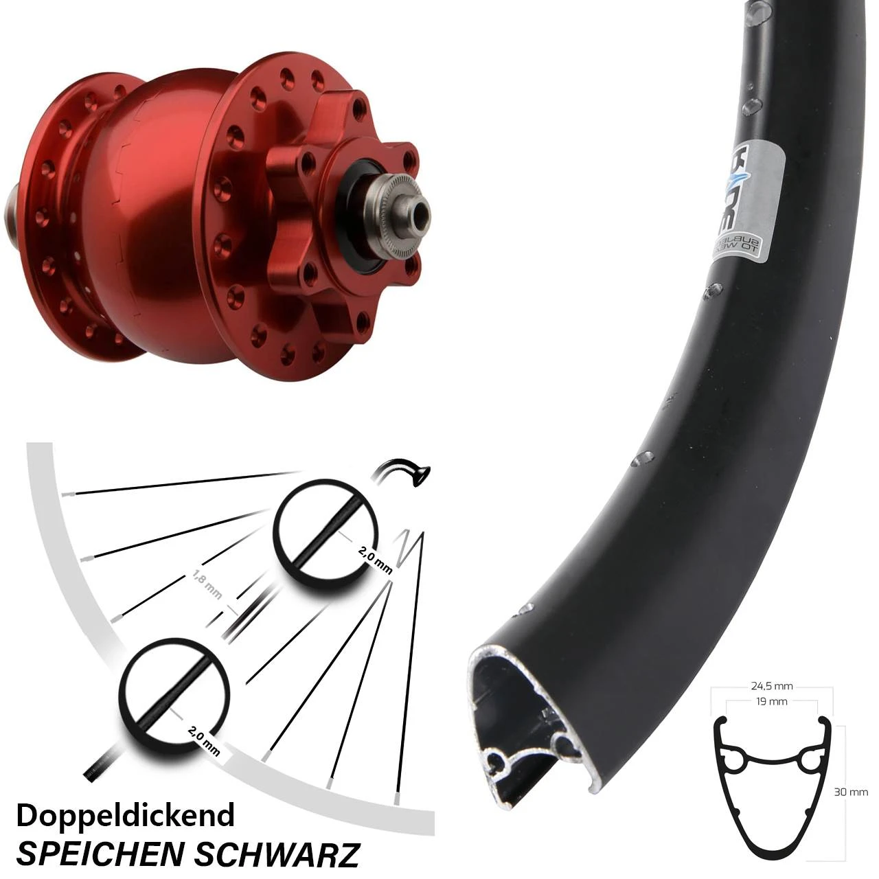 Technische Daten Vorderrad Ryde Dutch 19 Disc schwarz & Nabendynamo SON 28 Disc 6-Loch Hohlachse rot eloxiert