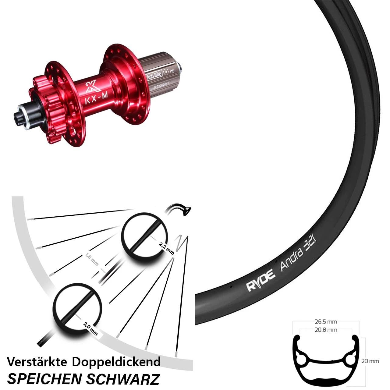 Technische Daten Hinterrad Ryde Andra 321 Disc schwarz und Nabe KX-M Hinterradnabe 5/135 6-Loch 11-fach rot