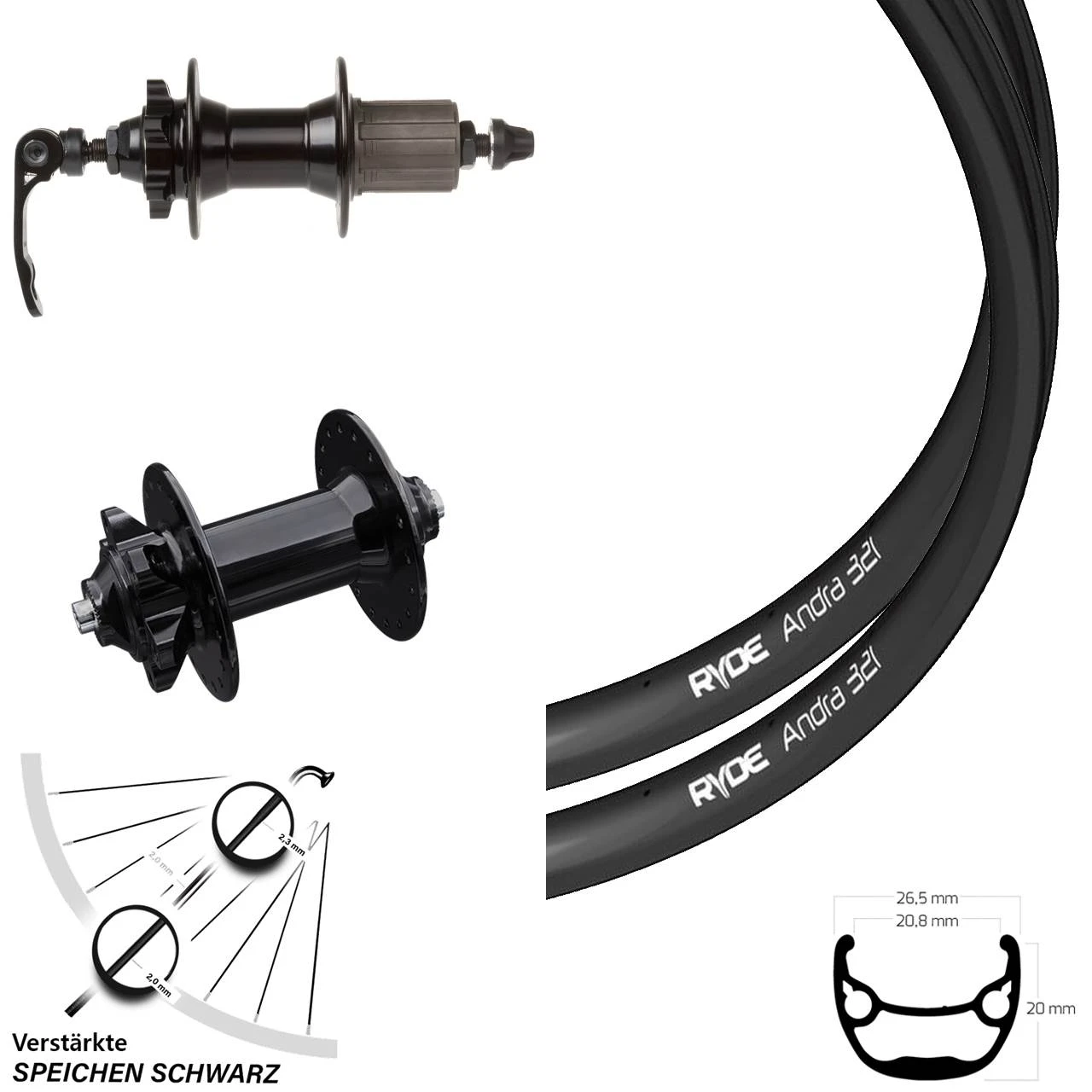 Die robusten Laufräder des beliebten Herstellers Ryde bringen Sie auch nach vielen Jahren zügig an ihren Bestimmungsort. Die schwarzen 28 Zoll, 29 Zoll Felgen (Hinterrad und Vorderrad) sind bei uns im Fahrradteile Online Shop im preiswerten Komplett-Set erhältlich. Dieses beinhaltet neben den schwarzen Ryde Andra 321 Felgen auch die passenden schwarzen Naben Formula DC-91 V2 6-Loch schwarz, Novatec 6-Loch 8-11-fach. Alle Komponenten unserer Sets sind selbstverständlich farbig und technisch optimal aufeinander abgestimmt und sind an ihrem Bike sofort einsatzbereit.