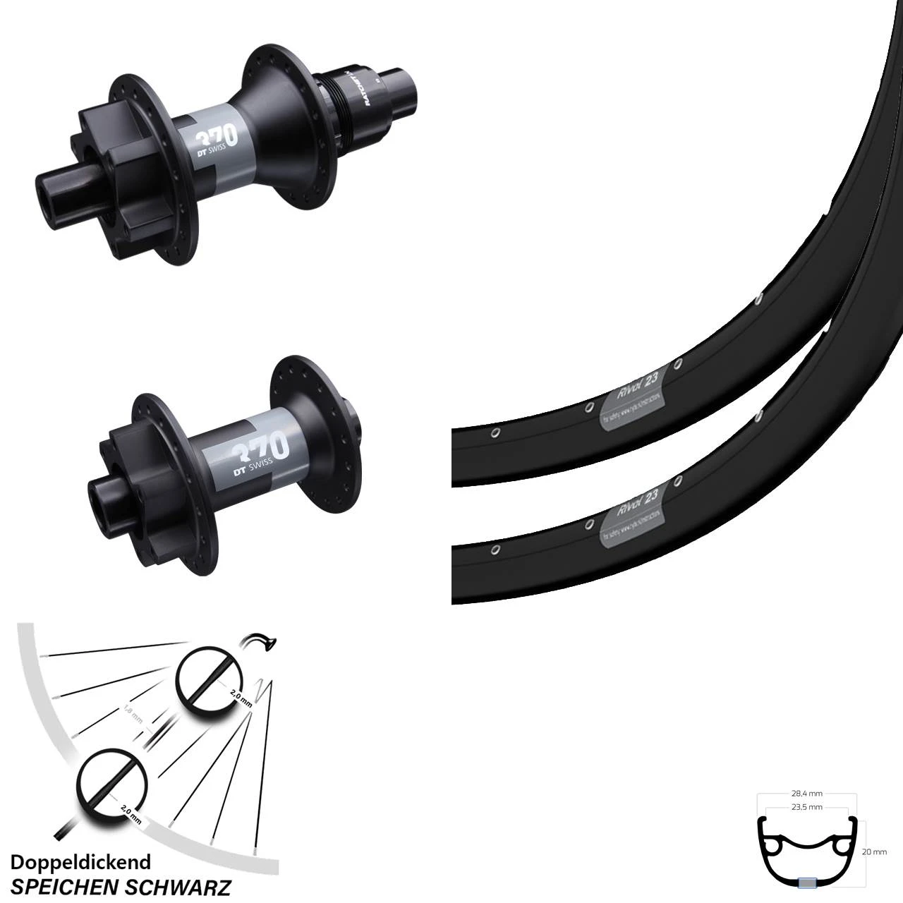 - 1 Ryde Rival 23 Vorderrad 29 Zoll mit DT Swiss 370 Steckachse 15×100 mm Nabe (Auswahl zwischen Messingnippel schwarz, Messingnippel silbern)
