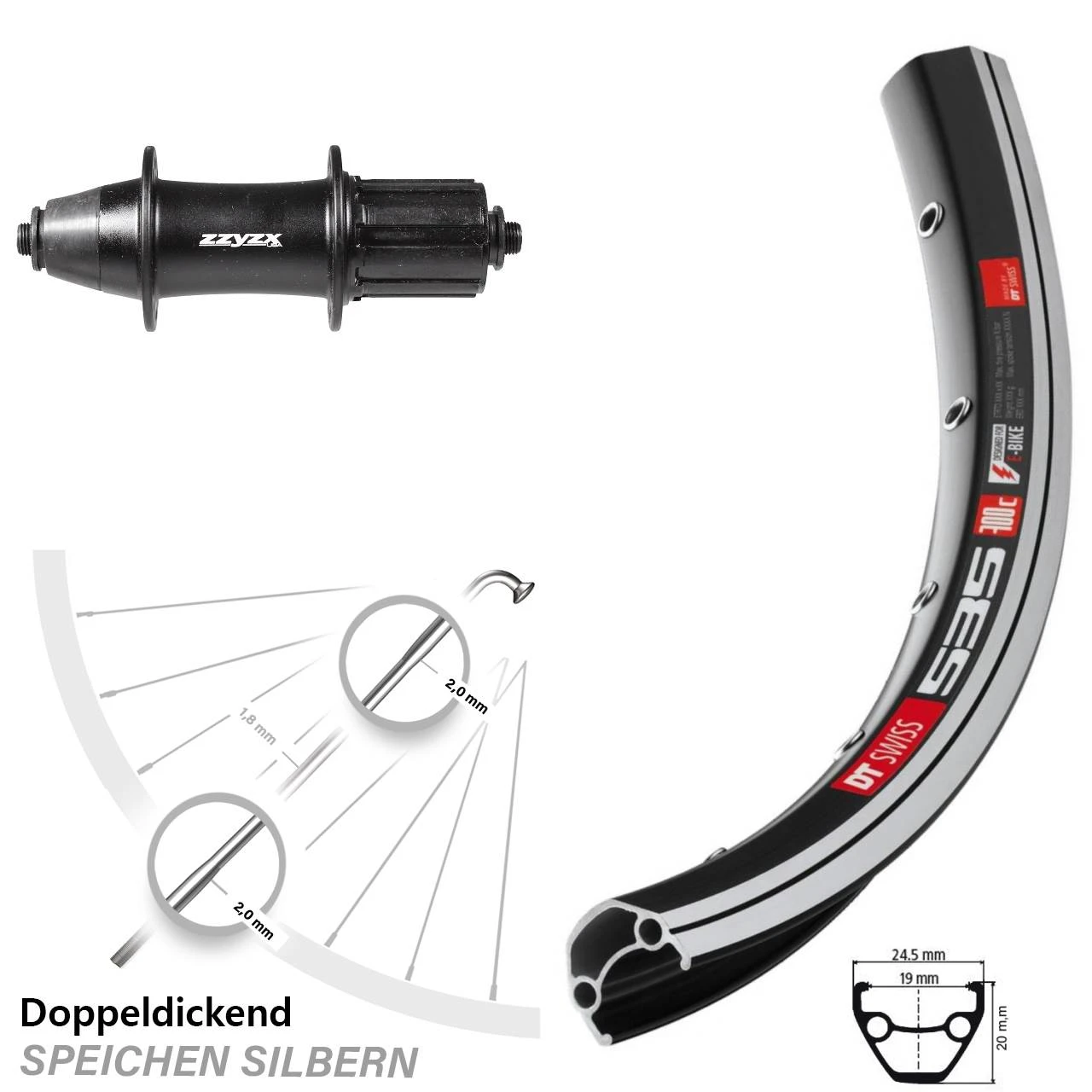 Technische Daten Hinterrad DT Swiss 535 Felgenbremse schwarz und Nabe Formula ZZYZX OV-32 schwarz
