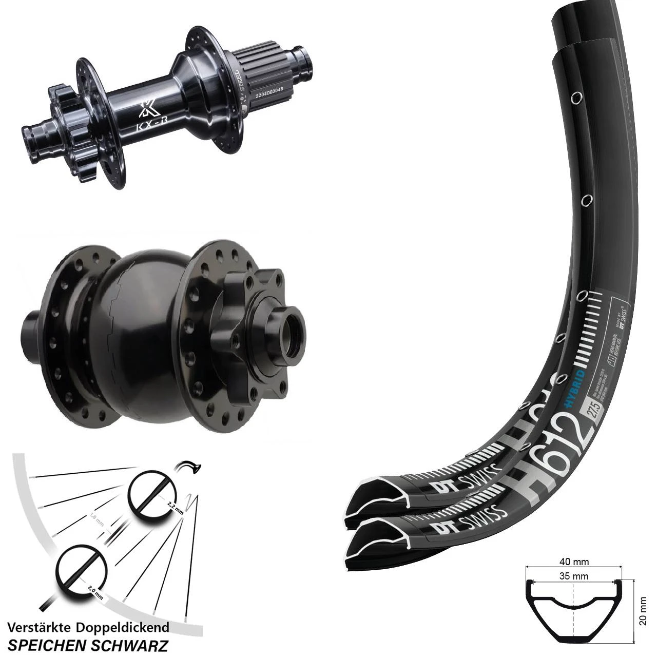 - 1 KX-B 12×148 mm Boost 6-loch DT Swiss H 612 Hinterrad 27,5+ Zoll Micro Spline 12-fach (Auswahl zwischen Messingnippel schwarz, Messingnippel silbern)