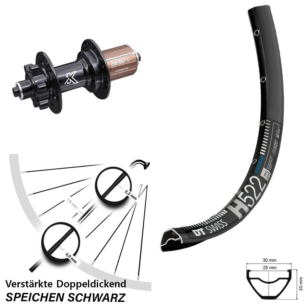 Technische Daten Hinterrad DT Swiss H 522 Disc schwarz und Nabe KX-M Hinterradnabe 5/135 6-Loch 11-fach
