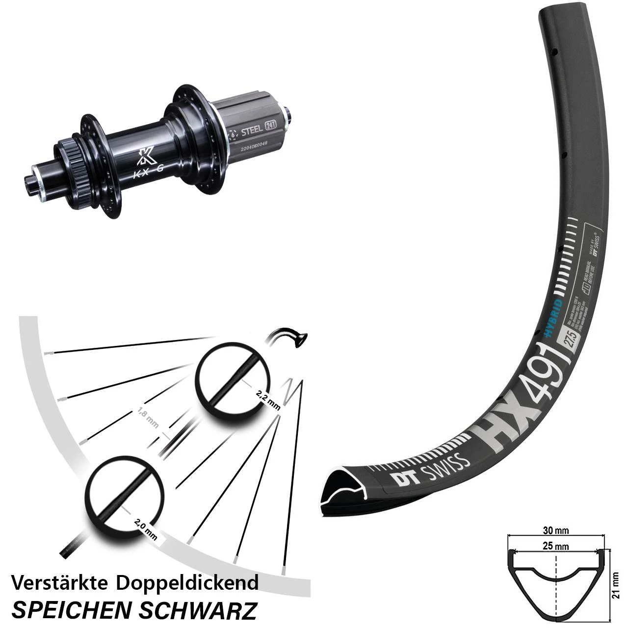 Technische Daten Hinterrad DT Swiss HX 491 DB Disc schwarz und Nabe KX-G/S Hinterradnabe Centerlock 5/135 schwarz