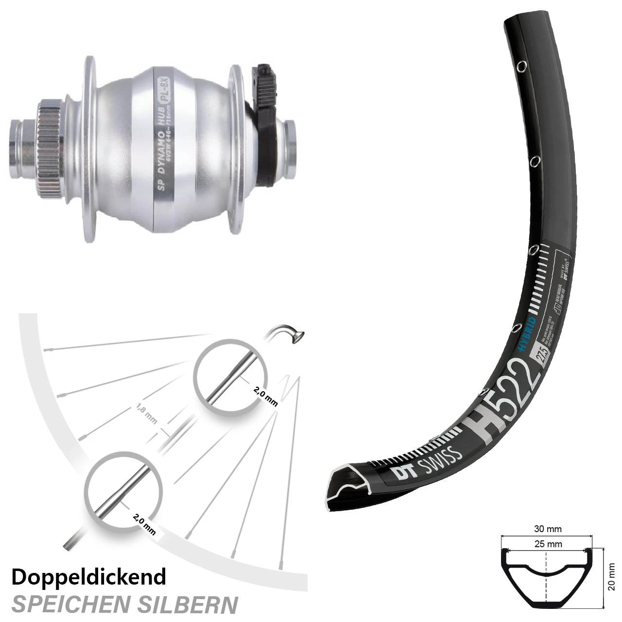 - Vorderrad 29 Zoll DT Swiss H 522 schwarz mit Nabendynamo Shutter Precision PL-8X-M silbern