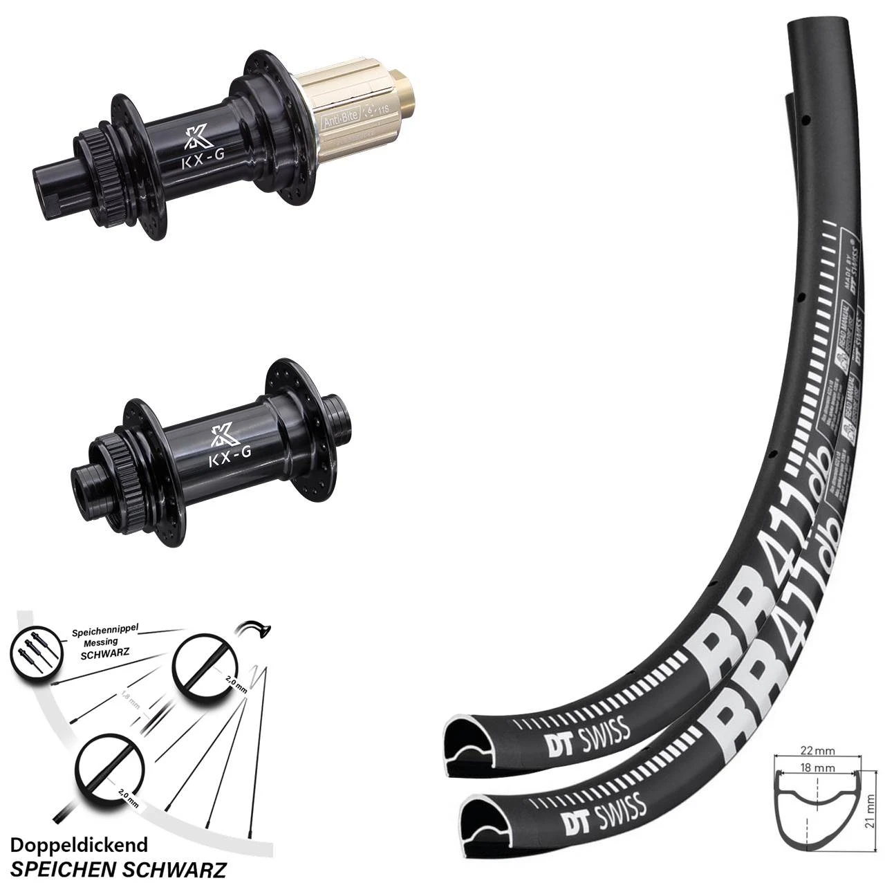- 1 Hinterrad 28 Zoll Centerlock KX-G Nabe Steckachse 12×142 mm 11-fach DT Swiss RR 411 (Auswahl zwischen Messingnippel schwarz, Messingnippel silbern)