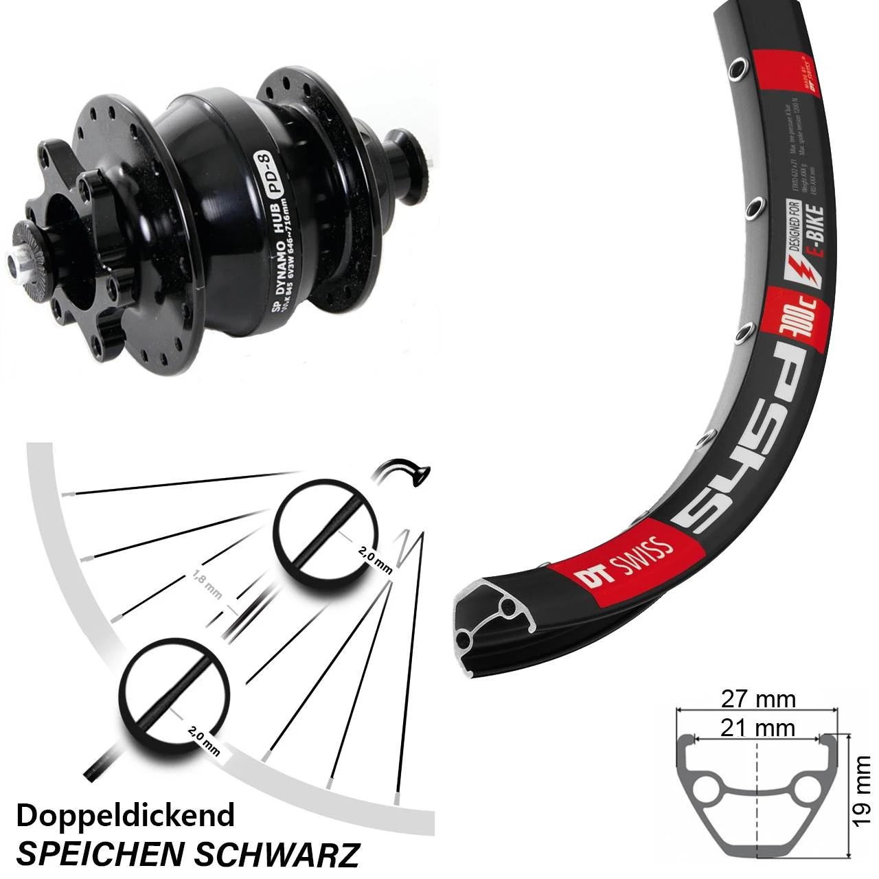 - Vorderrad 28 Zoll, 29 Zoll DT Swiss 545 schwarz mit Nabendynamo Shutter Precision PD-8 schwarz