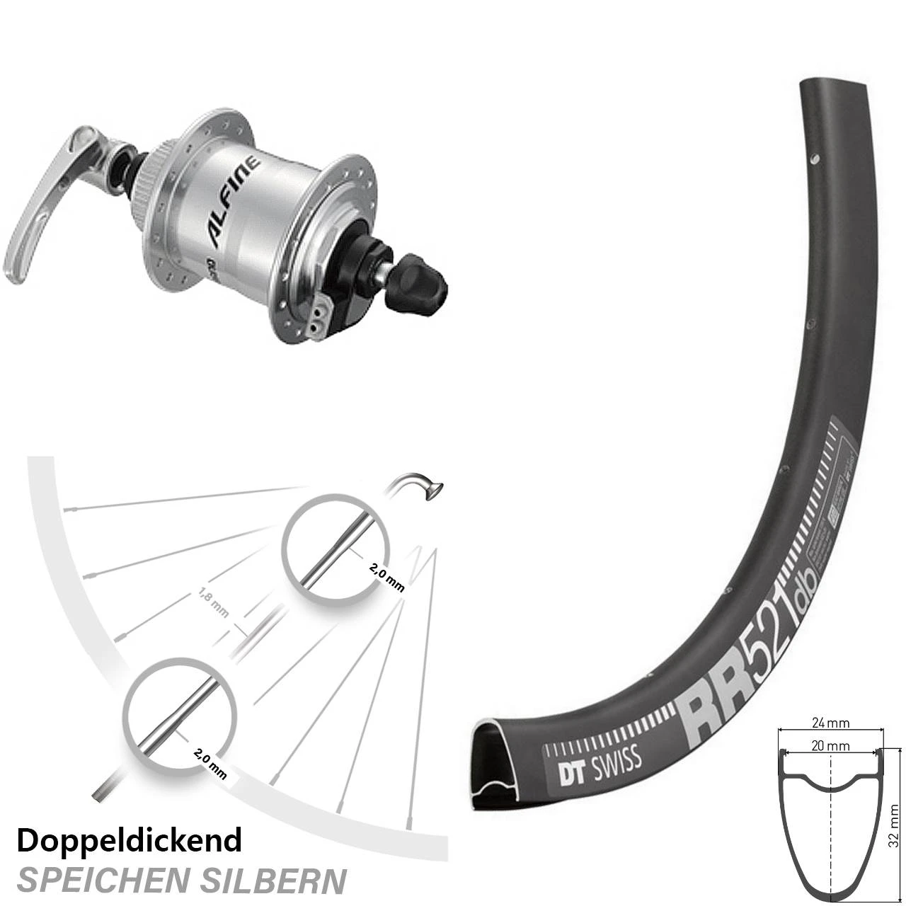 - Vorderrad 28 Zoll DT Swiss RR 521 DB schwarz mit Nabendynamo Shimano Alfine DH-S701 silbern