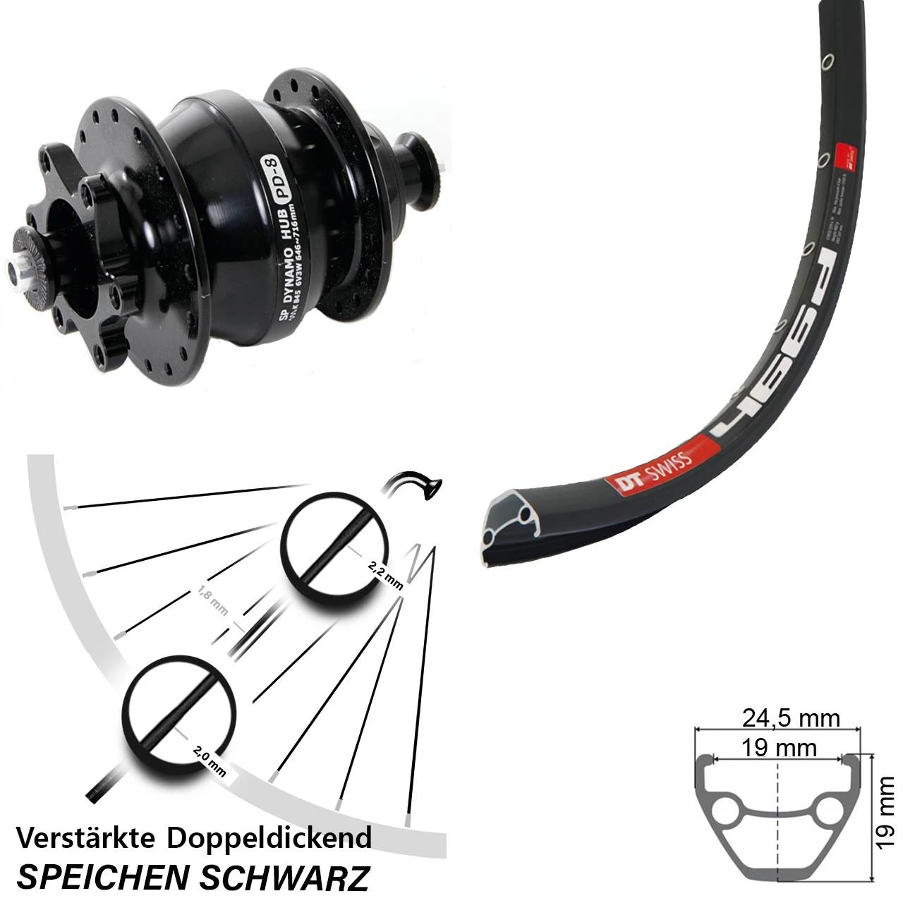 Technische Daten vorderes Laufrad DT Swiss 466D Disc schwarz & Nabendynamo Shutter Precision PD-8 Disc 6-Loch schwarz