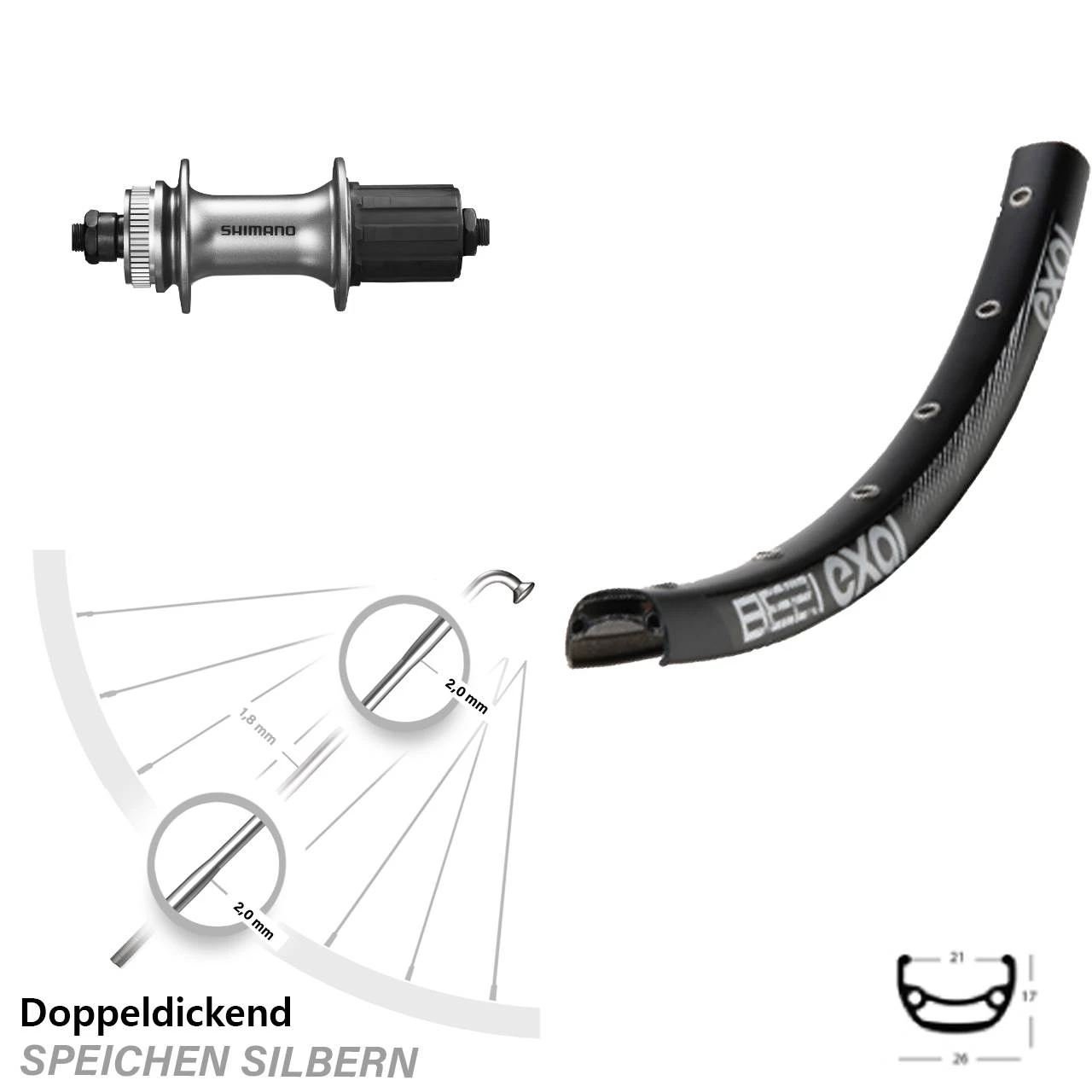 Technische Daten Hinterrad Exal BE 21 schwarz und Nabe Shimano FH-M4050 sibern