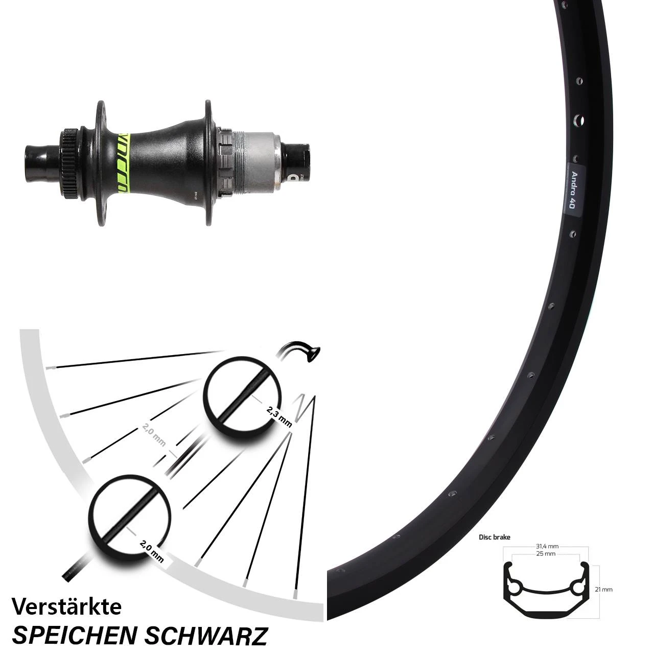 Das robuste 26 Zoll Hinterrad hat 32 Speichen und bringt Sie auf Bikes mit Centerlock Scheibenbremsen sicher und bequem voran. Auf ausphaltierten Straßen ,wie auch im Gelände bei unbefestigten Streckenverhältnissen bietet Ihnen das Hinterrad die nötige Stabilität. Neben einer schwarzen Formula CL-1421 Syncros XD Nabe ist eine stabile schwarze Ryde Andra 40 Disc schwarz Felge in das Vorderrad eingebaut. Die ETRTO Größe hat ein Maß von 25-559 mm, die Einbaubreite liegt bei 142 mm und das zugelassene Systemgewicht ist auf bis zu 180 kg ausgelegt. Das Laufrad kann ideal an Rädern mit Kettenschaltungen im E-Bike bis 25 km/h Bereich verwendet werden!