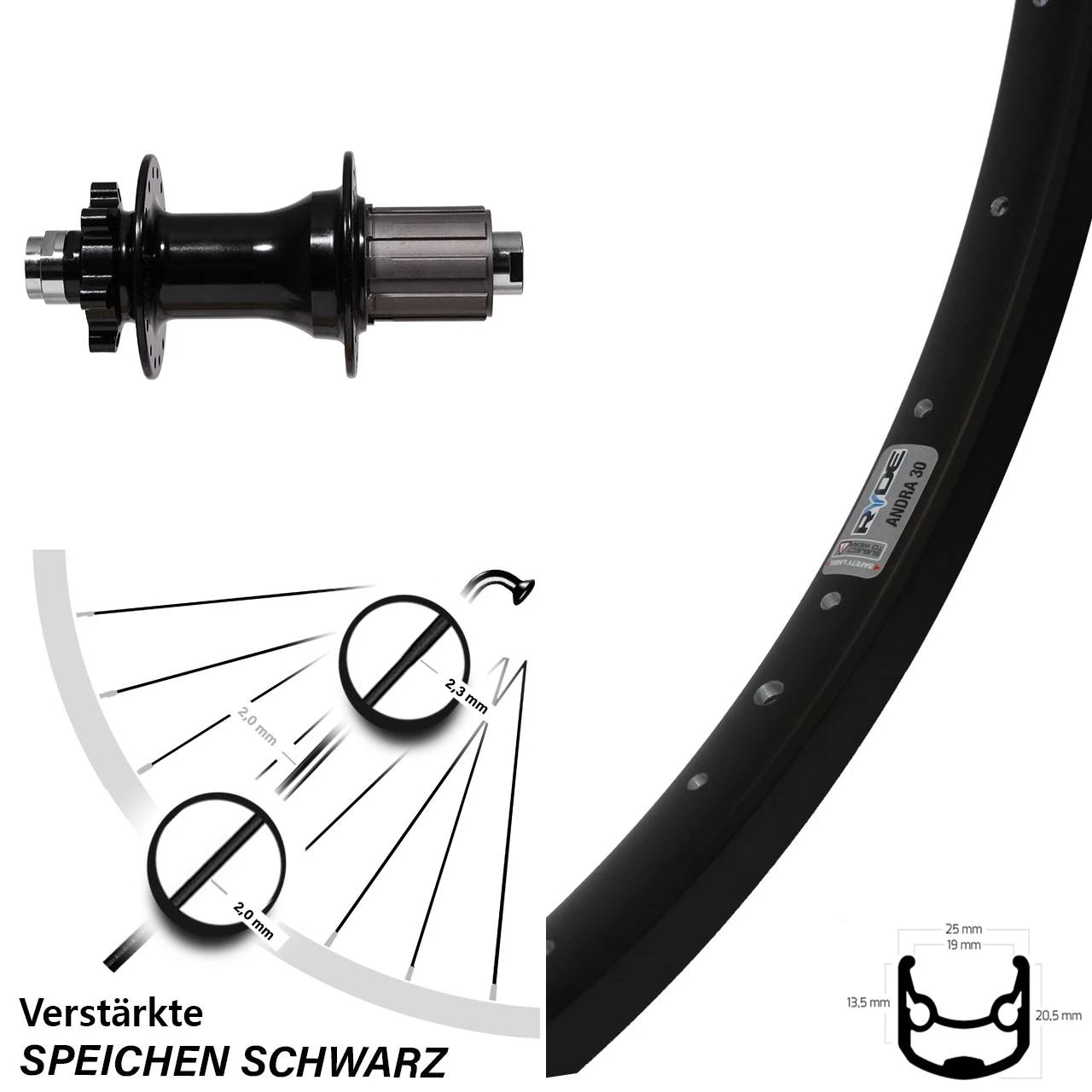 Technische Daten Hinterrad Ryde Andra 30 Disc schwarz und Nabe Formula Boost 6-Loch 148 mm