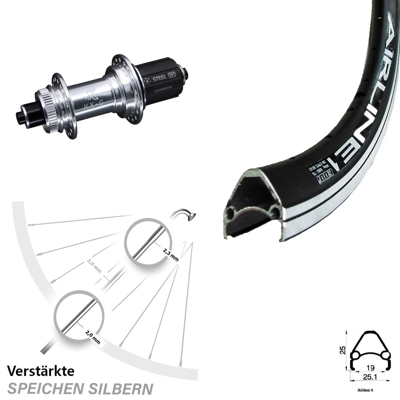 - 36 silberne Sapim Speichen mit Speichenstärke 2,34/2,0 mm Edelstahl verstärkt – besonders stabile und verstärkte Dickendspeiche mit 2,34 mm Durchmesser im kritischen Bereich der Nabe