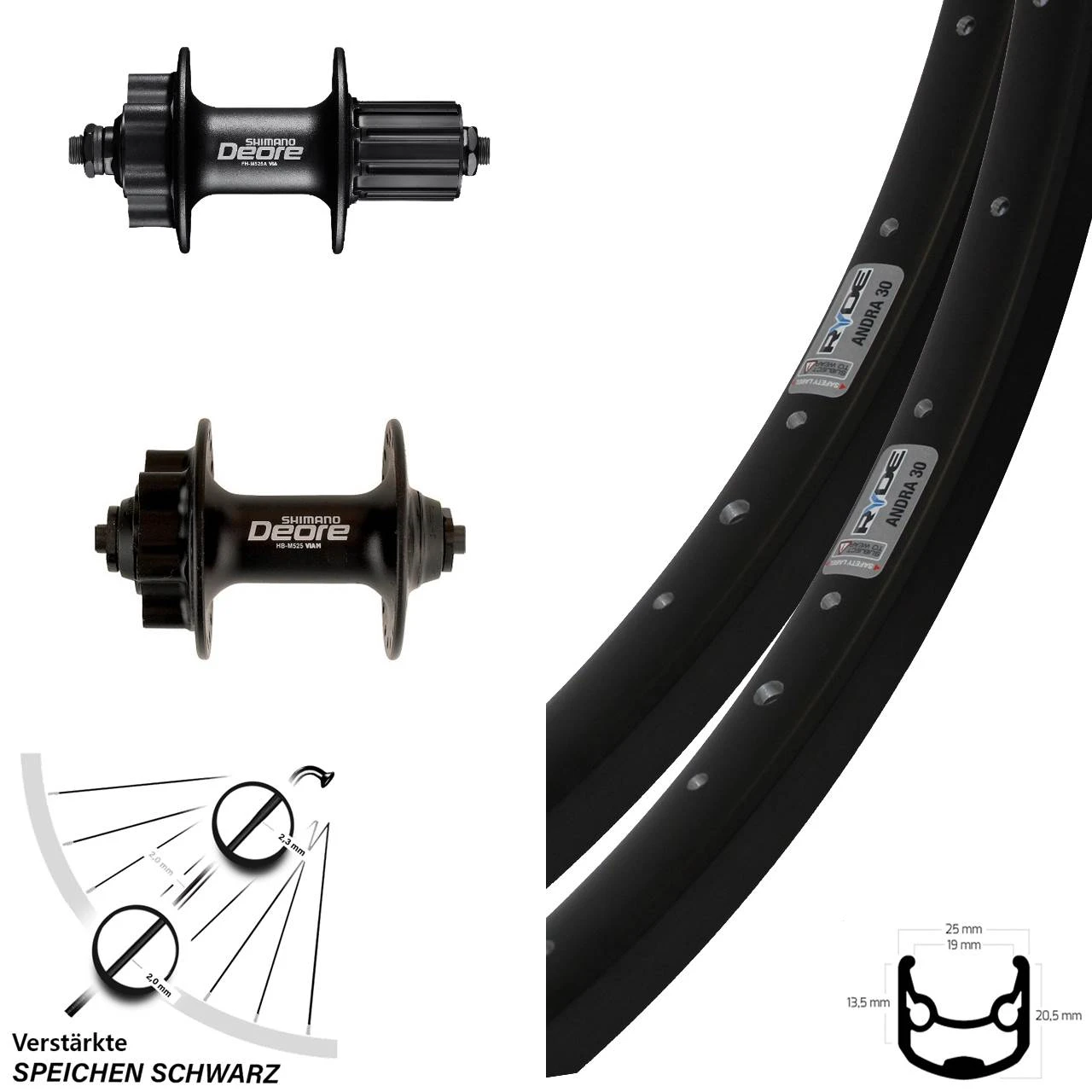 Technische Daten Laufradsatz 26 Zoll Shimano Deore 525 Schnellspanner Ryde Andra 30 Disc 6-loch