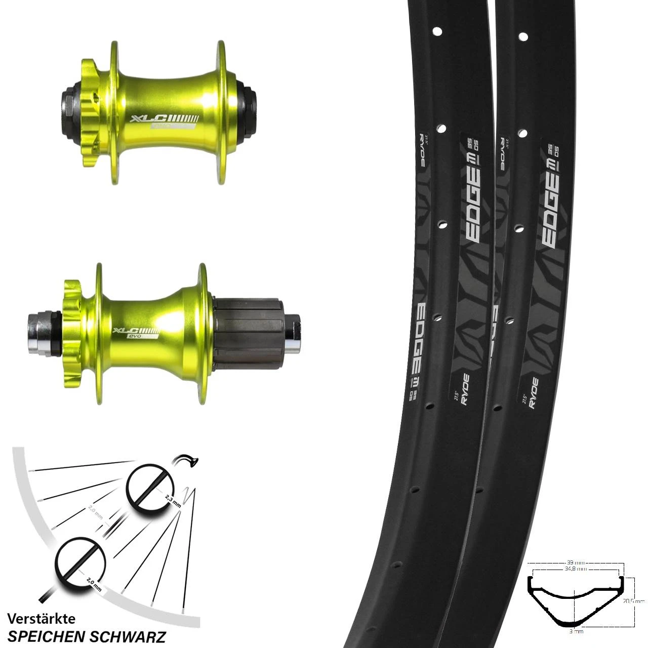 Perfekt miteinander harmonierende Fahrradbauteile ermöglichen Ihnen bei jeder Fahrt ein effektives Fahrerlebnis. Mit unseren ausgereiften Laufradsätzen (hinteres und vorderes Laufrad) für Ihr Fahrrad erhalten Sie den gewünschten Komfort und die gewohnte Qualität in Einem! Die Felgen dieses Laufrad-Sets haben eine Größe von 27,5 Zoll, 27,5+ Zoll. Die Einbaubreite der Ryde Edge M35 OS Felgen beträgt 100, 142. Passend dazu erhalten Sie die Naben XLC Evo HR Disc grün Steckachse, XLC Evo VR Disc grün Steckachse in grün. Dieses Laufrad-Set wird abgerundet mit 32 mit einer Stärke von 2,34/2,0 mm Edelstahl verstärkt in der Farbe schwarz. Bitte beachten Sie, dass dieses Set nur für Fahrräder mit Scheibenbremsen bestimmt ist.