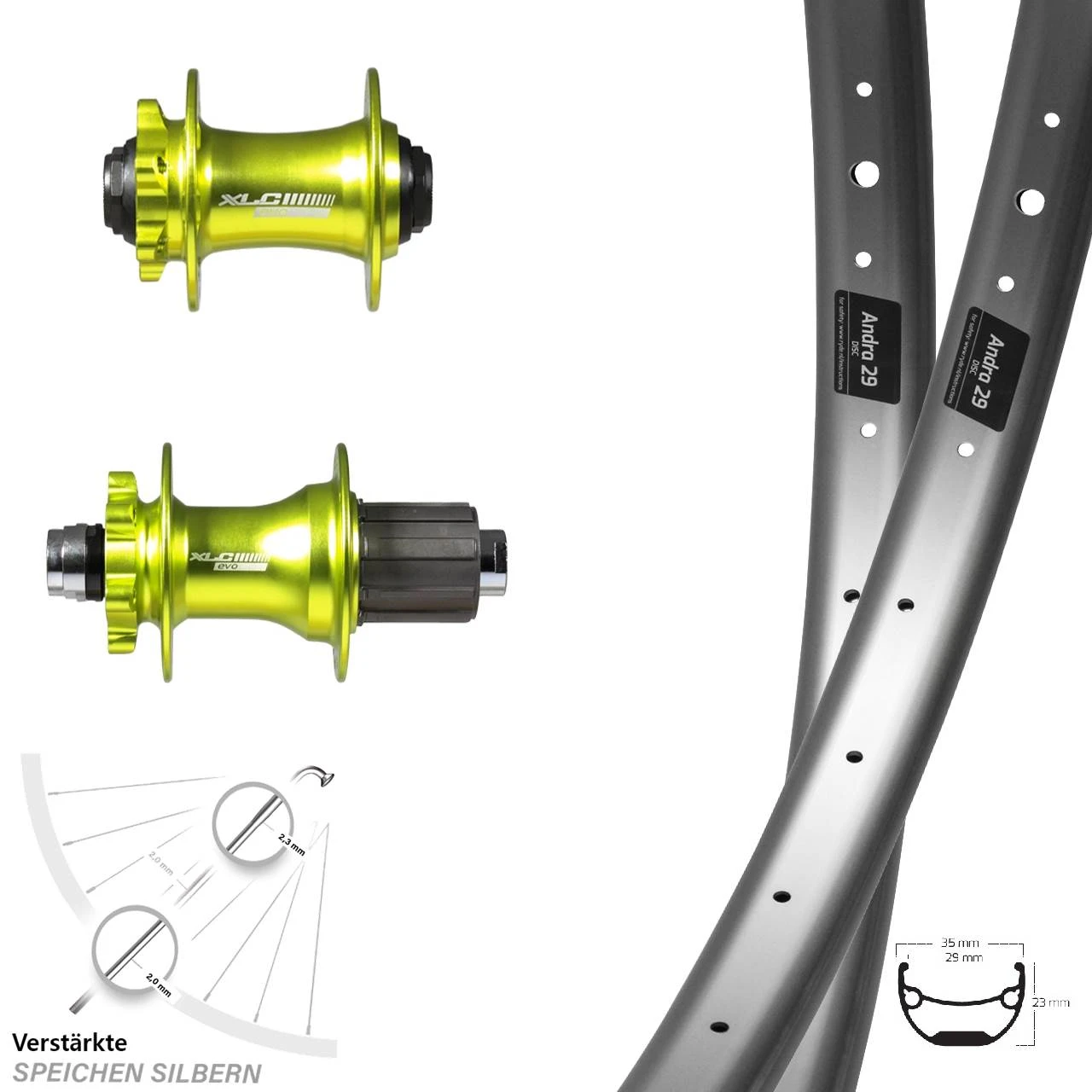 Produktbeschreibung Laufradsatz 29 Zoll Ryde Andra 29 silber mit Nabe grün XLC Evo Steckachse