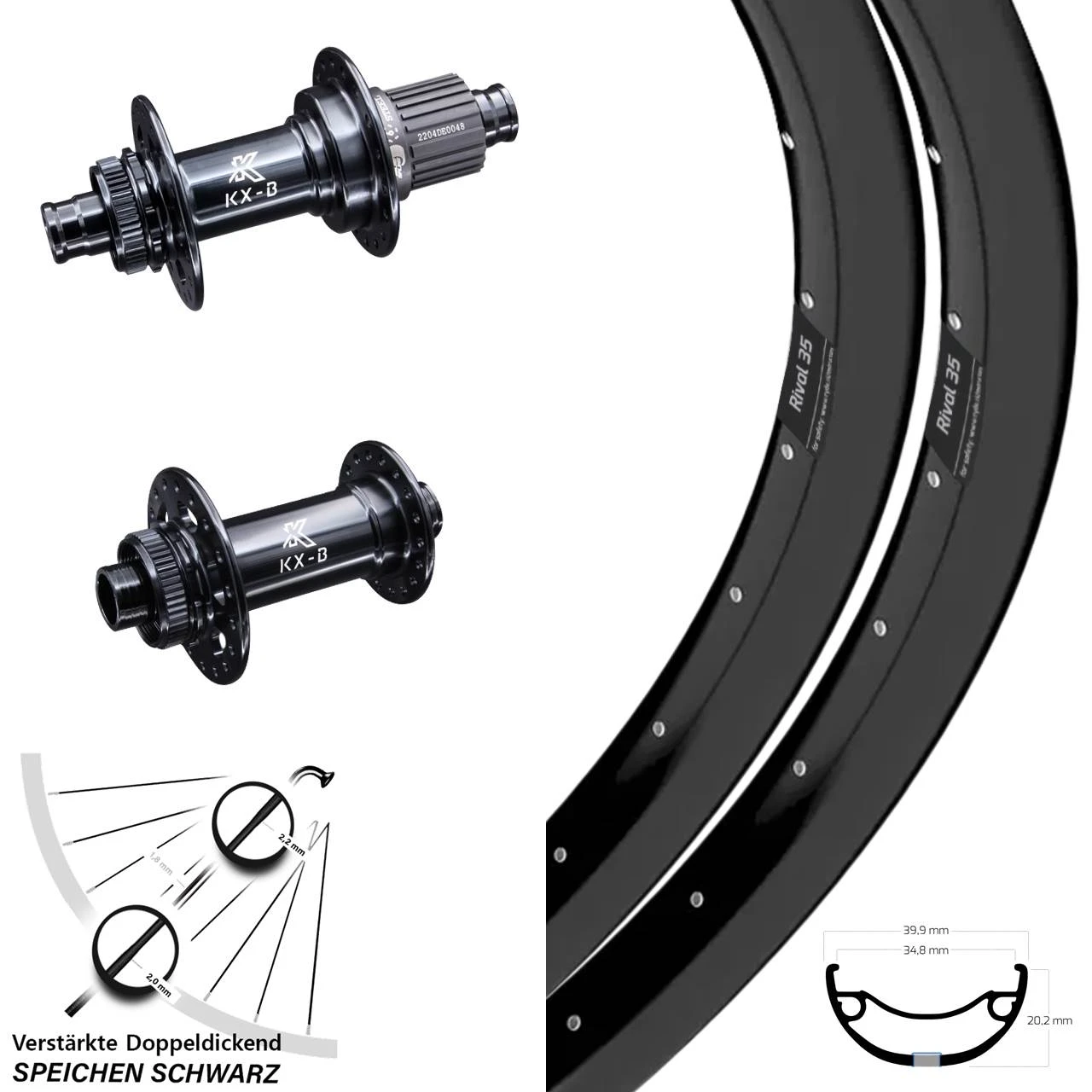 Genießen Sie die Annehmlichkeiten unserer durchdachten Bike-Laufradsätze! Funktional und optisch optimal zusammengestellt bieten unsere Laufrad-Komplett-Sets ein hohes Maß an Stabilität. Die 29 Zoll, 29+ Zoll Felgen Ryde Rival 35 Disc kommen aus dem Hause Ryde und verfügen über eine solide Verarbeitung und eine beständige Laufleistung. Passend dazu liefern wir Ihnen die belastbaren schwarzen Naben KX-B Boost Hinterradnabe 12/148 Centerlock Stahl Micro Spline, KX-B Boost Vorderradnabe 15/110 Centerlock. 36 mit einer Stärke von 2,2-1,8-2,0 mm Edelstahl sorgen für eine hervorragende Zuverlässigkeit. Dieses harmonisch Laufrad-Set ist für Bikes mit Scheibenbremse geeignet. Alle Laufräder aus unserem Shop werden bereits komplett eingespeicht und zentriert an Sie ausgeliefert und sind an ihrem Bike sofort einbaubereit.