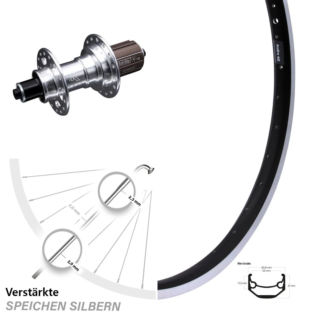 Nabe 6-fach gelagert KX-T 135 mm silbern eloxiert Ryde Andra 40 Hinterrad 26 Zoll mit verstärkten Speichen