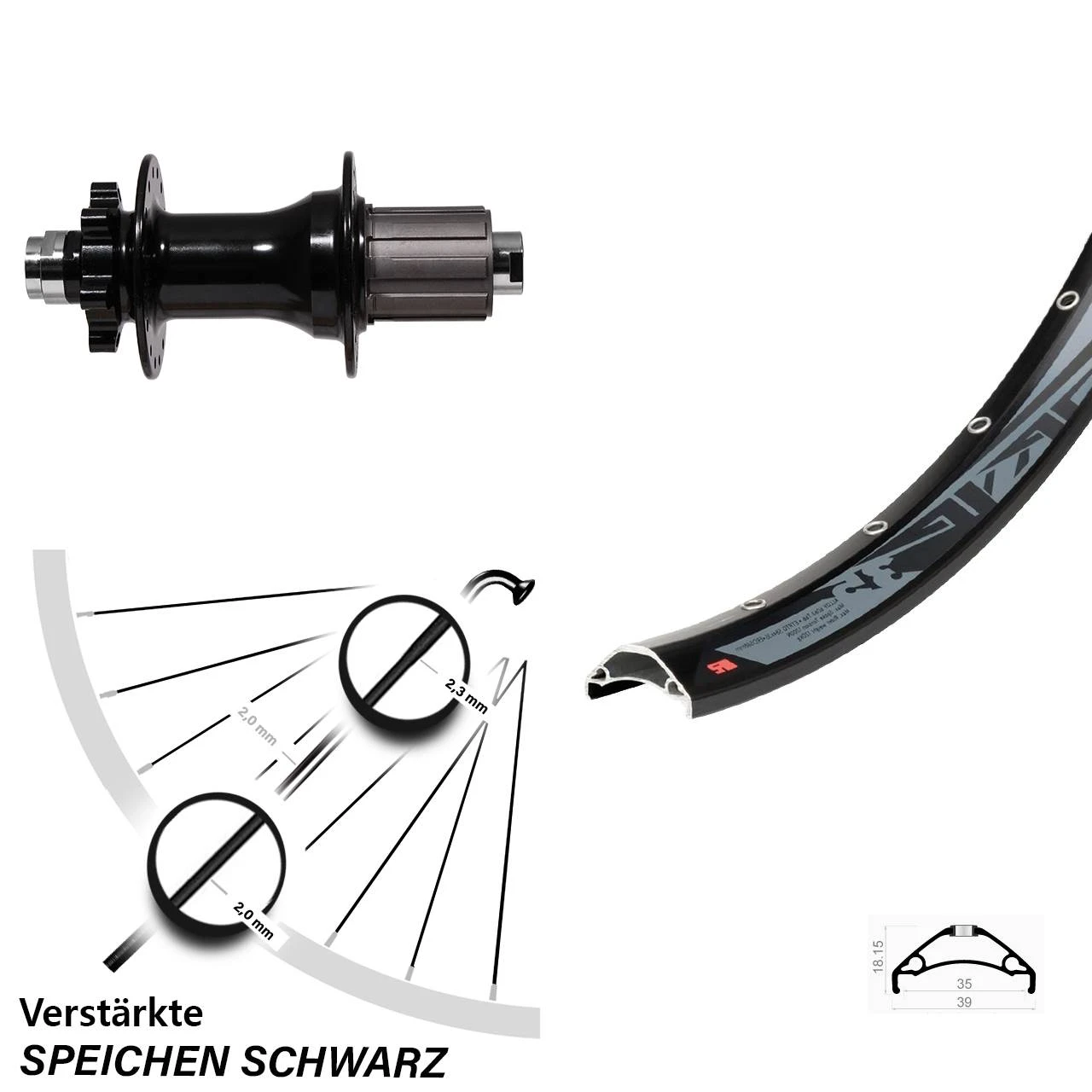 - 32 schwarze Sapim Speichen mit Speichenstärke 2,34/2,0 mm Edelstahl verstärkt – besonders stabile und verstärkte Dickendspeiche mit 2,34 mm Durchmesser im kritischen Bereich der Nabe