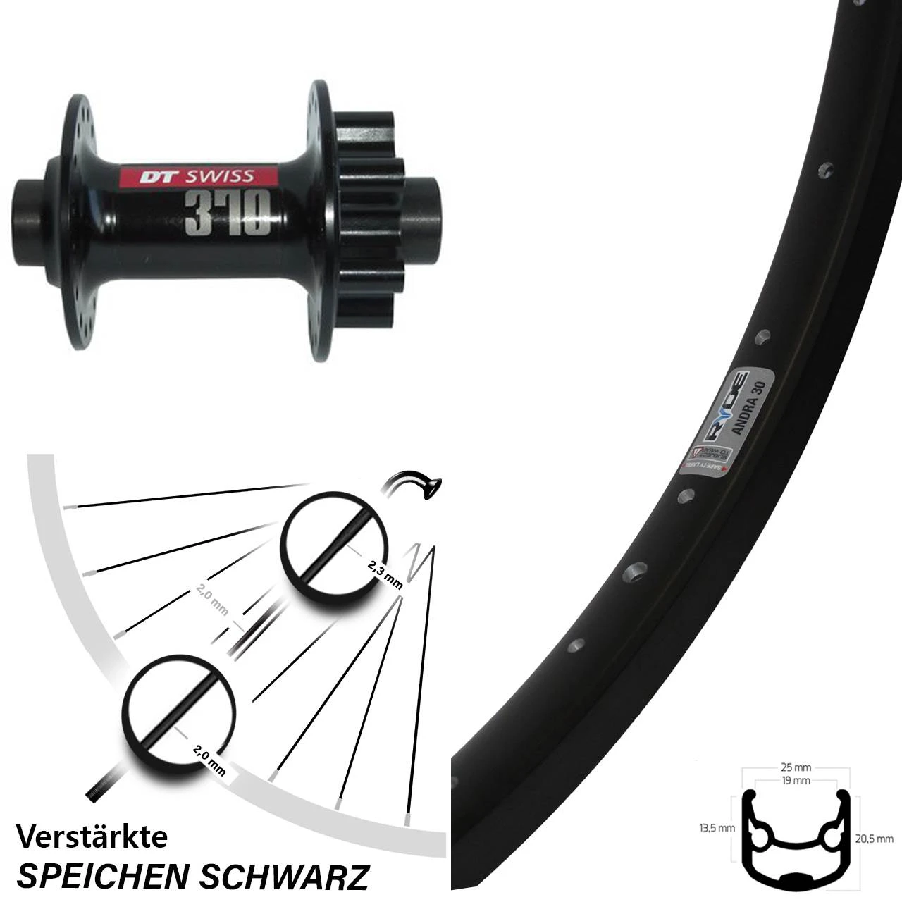 Technische Daten Vorderrad Ryde Andra 30 Disc schwarz mit Nabe DT Swiss 370 Disc 6-Loch 15/100