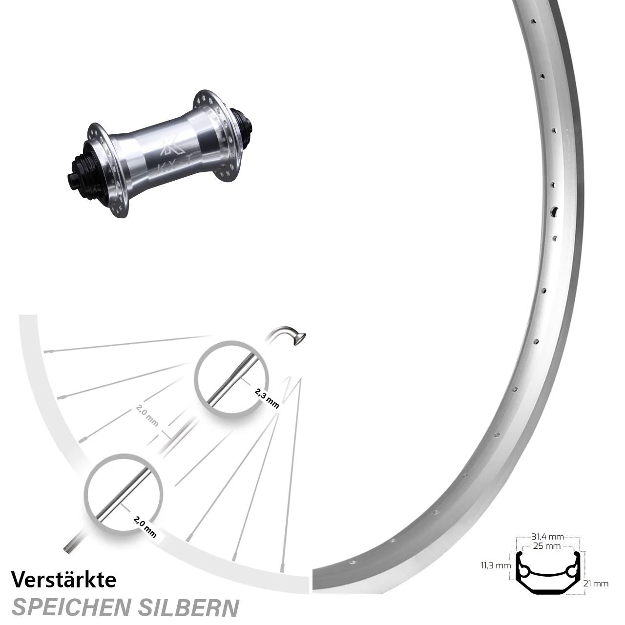 - Nabe: KX-T Vorderradnabe 5/100 Felgenbremse silbern