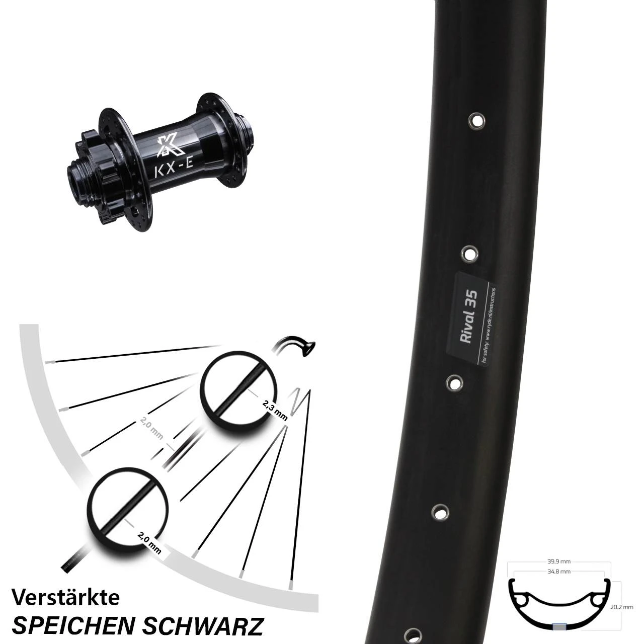 mit empfohlener Reifenbreite 60-80 mm - Nabe: KX-E Vorderradnabe 6-Loch 15/100 mm schwarz