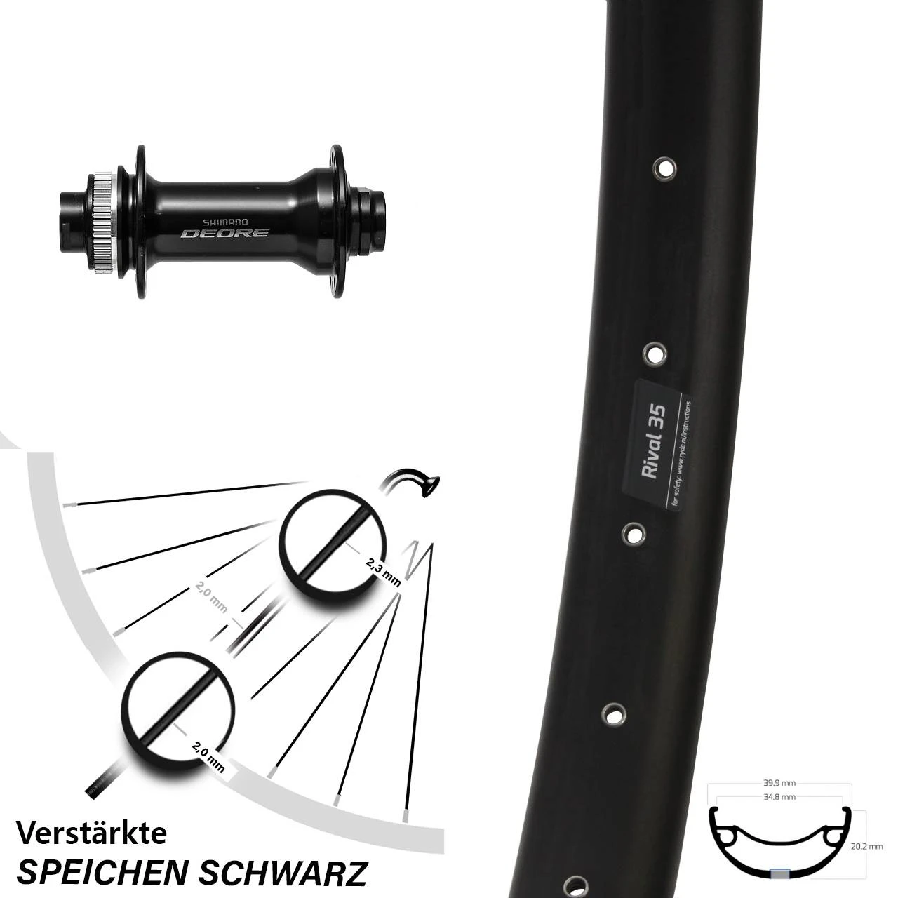 Technische Daten Vorderrad Ryde Rival 35 Disc schwarz mit Nabe Shimano Deore HB-M6010-B schwarz