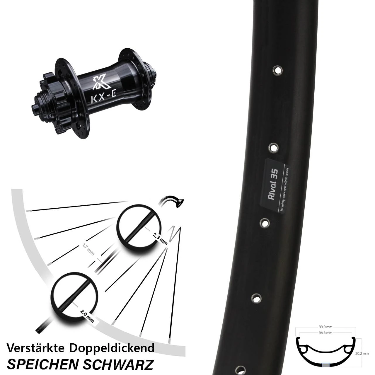mit empfohlener Reifenbreite 56-76 mm - Nabe: KX-E Vorderradnabe 6-Loch 5/100 mm schwarz