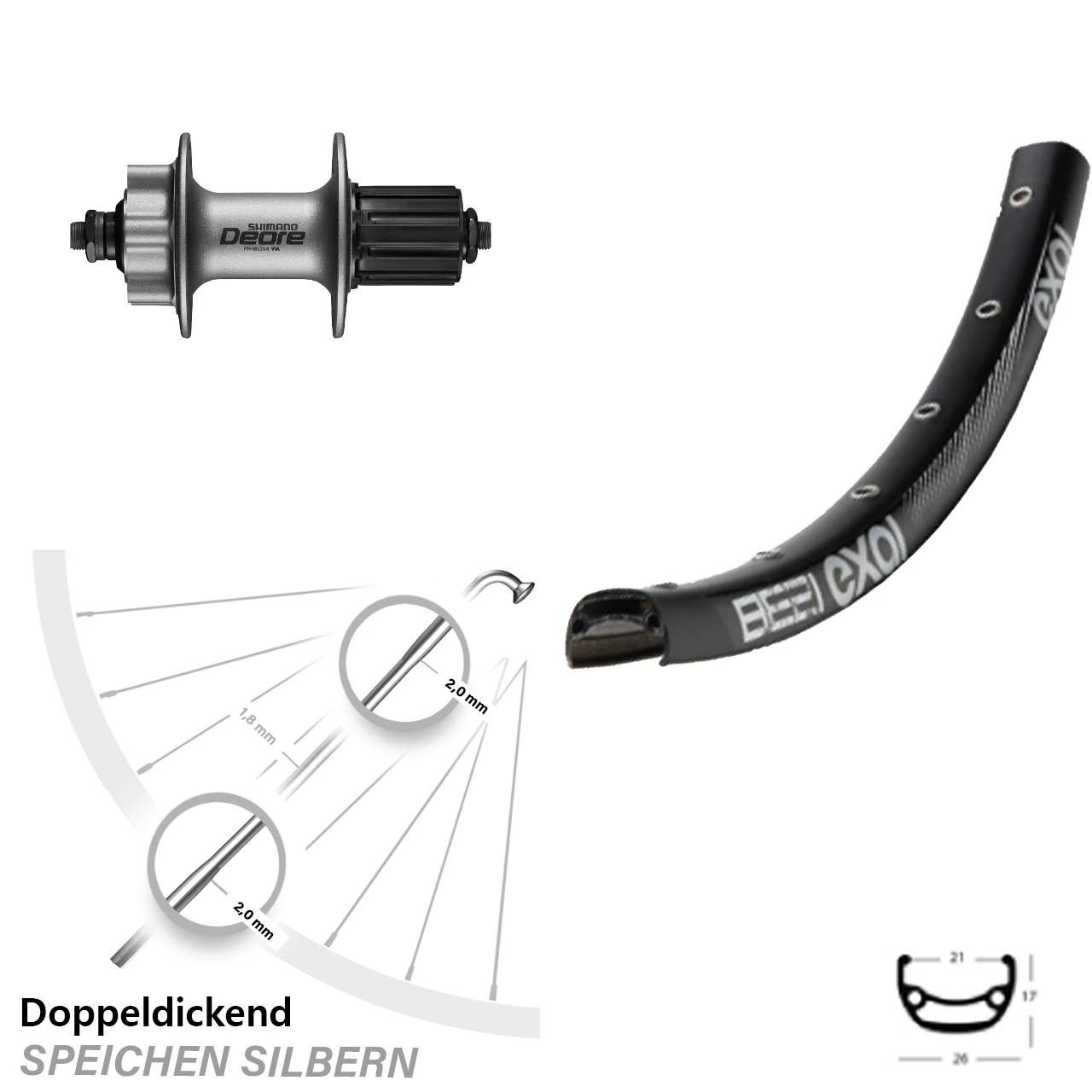 Technische Daten Hinterrad Exal BE 21 schwarz und Nabe Shimano FH-M525A silbern