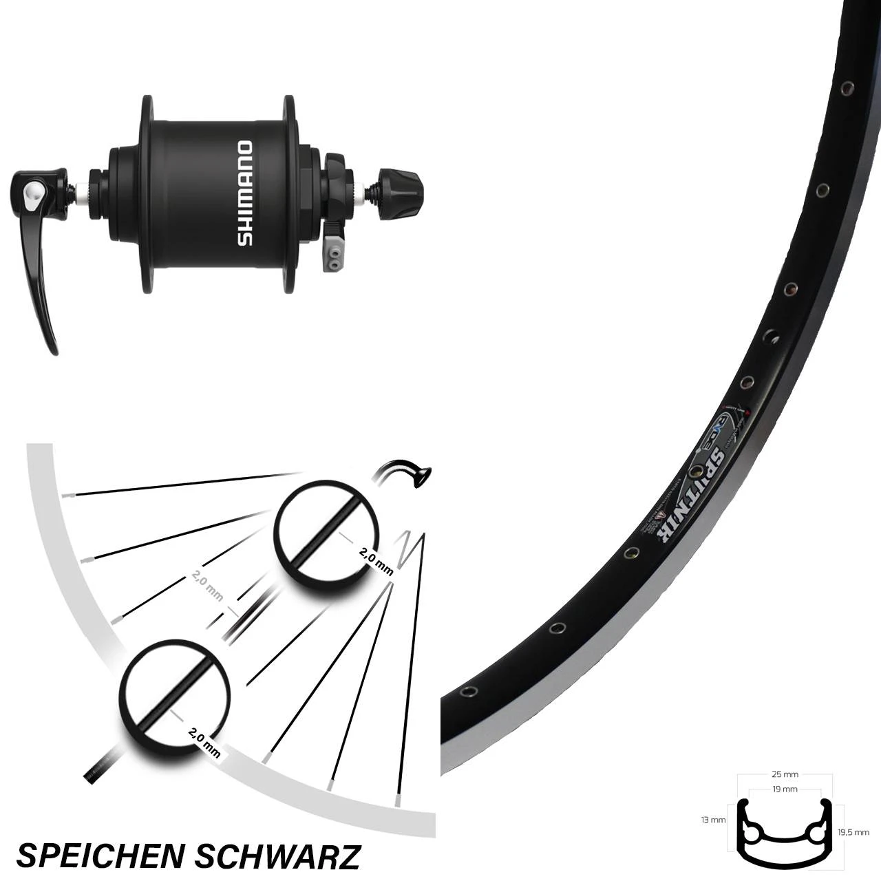 Technische Daten vorderes Laufrad Ryde Sputnik schwarz & Nabendynamo Shimano DH-T4000-1N schwarz