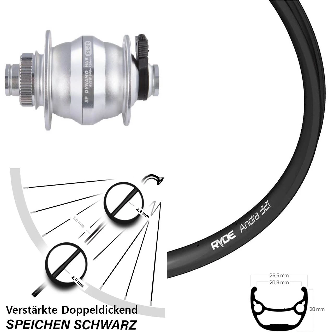 - Vorderrad 28 Zoll, 29 Zoll Ryde Andra 321 schwarz mit Nabendynamo Shutter Precision PL-8X-M silbern