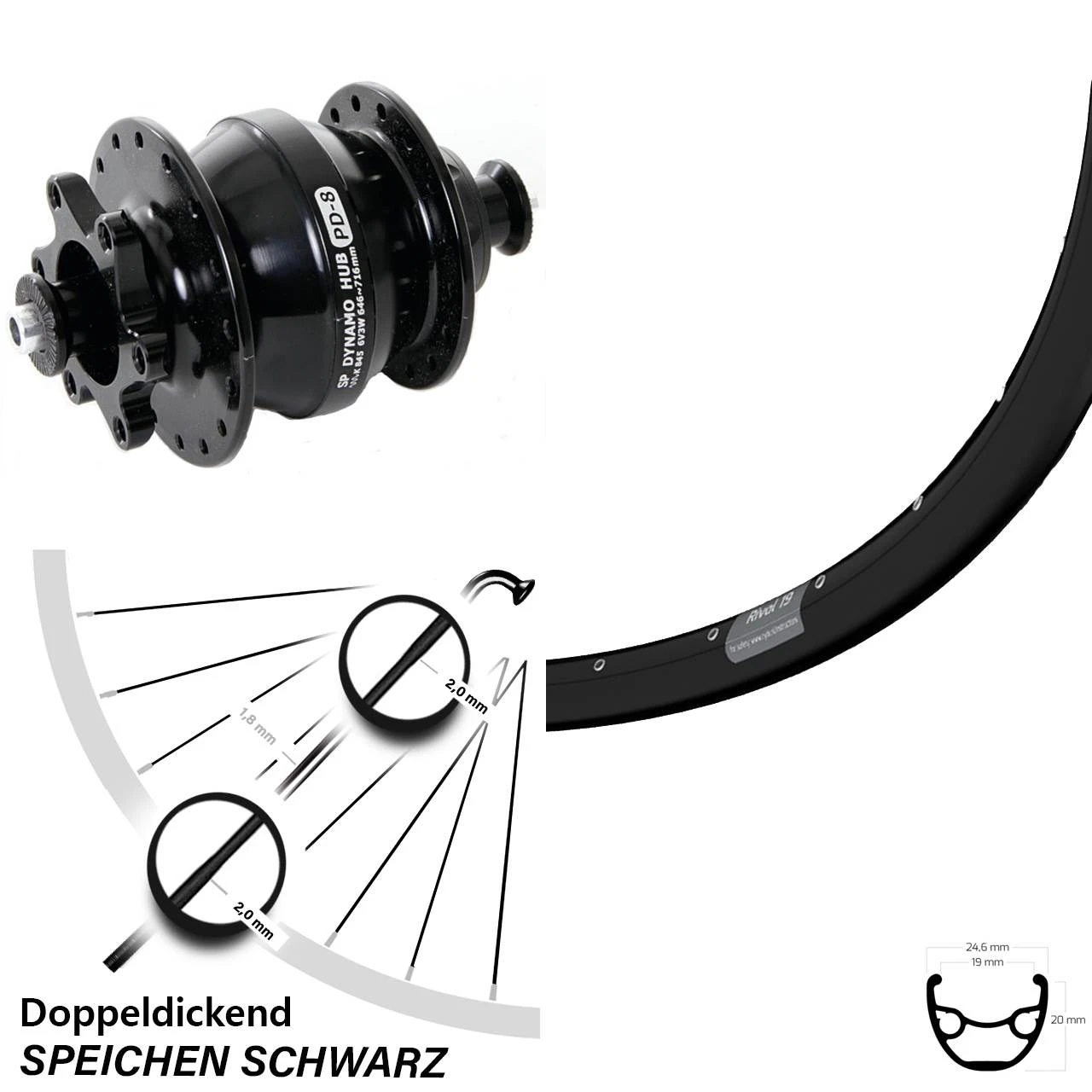 Technische Daten vorderes Laufrad Ryde Rival 19 Disc schwarz & Nabendynamo Shutter Precision PD-8 Disc 6-Loch schwarz