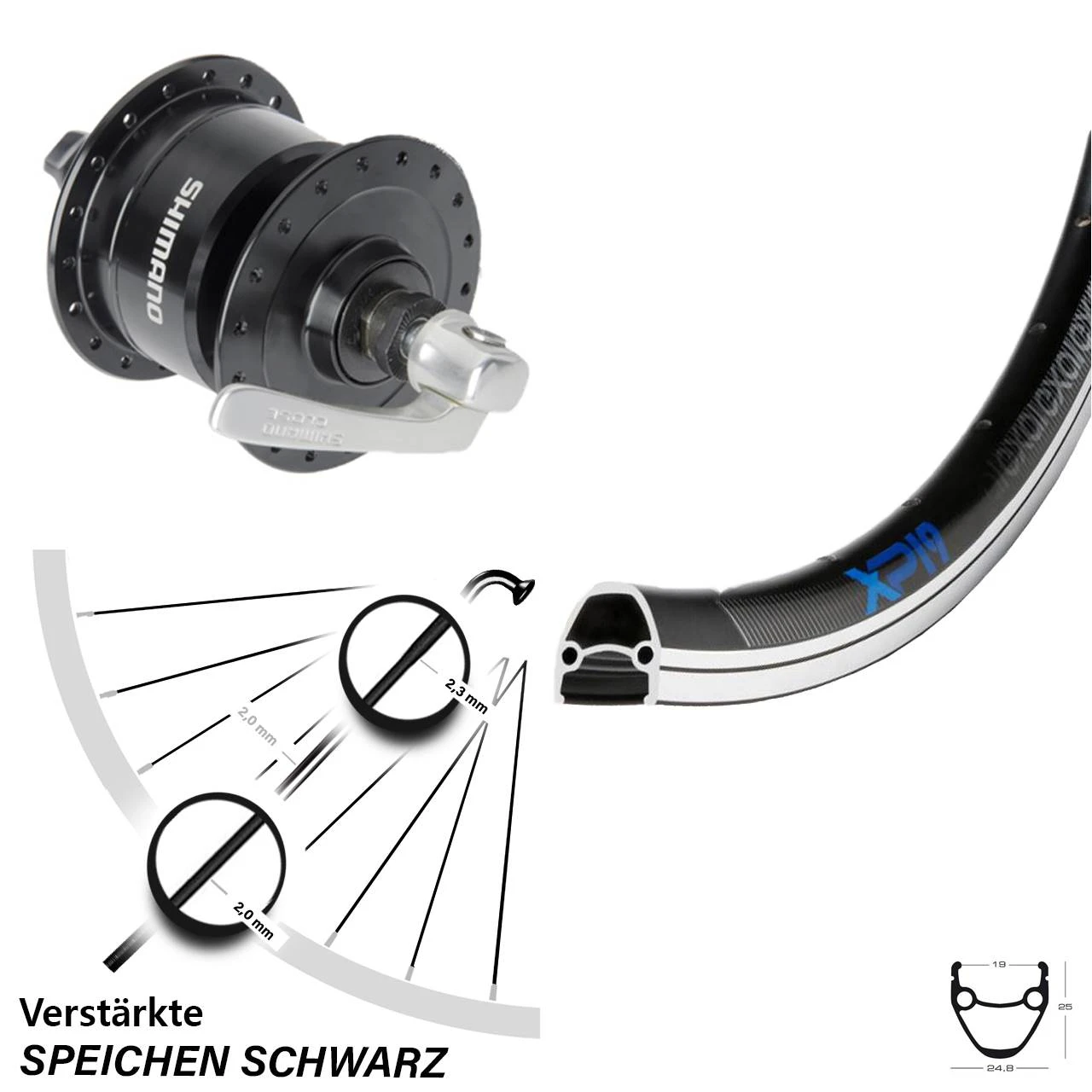 Technische Daten vorderes Laufrad Exal XP 19 schwarz & Nabendynamo Shimano DH-3N72 schwarz