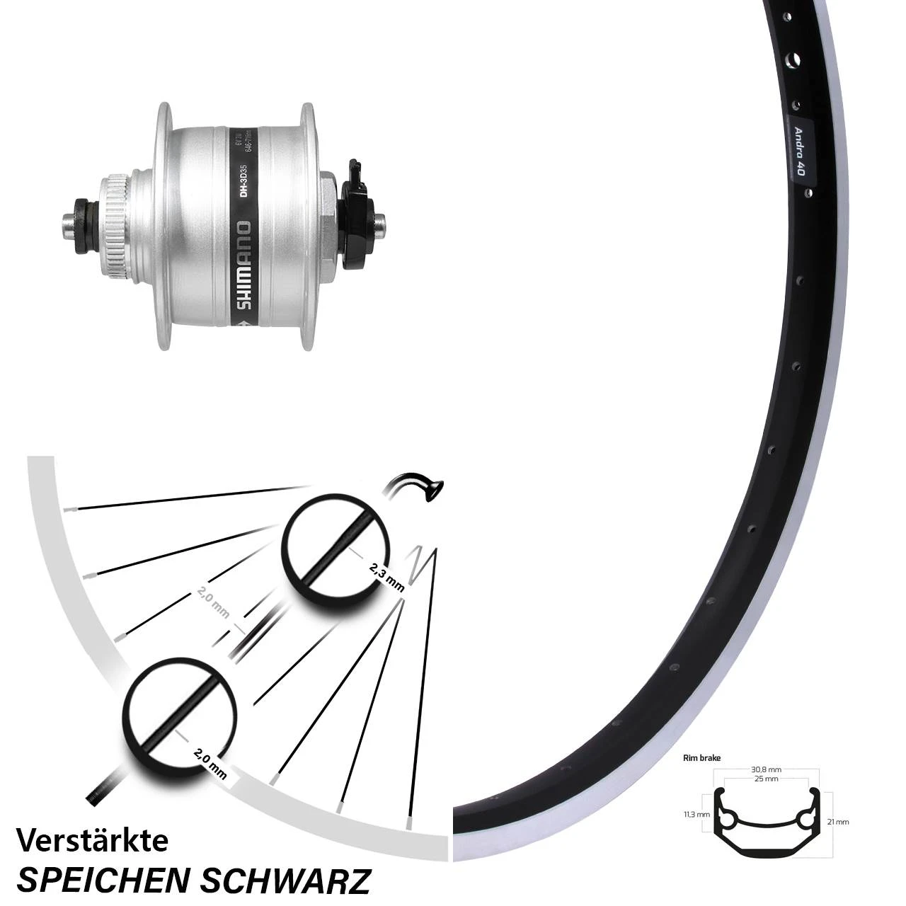 Produktbeschreibung Vorderrad 20 Zoll Shimano DH-3D35 Nabendynamo Ryde Andra 40 für Felgenbremse