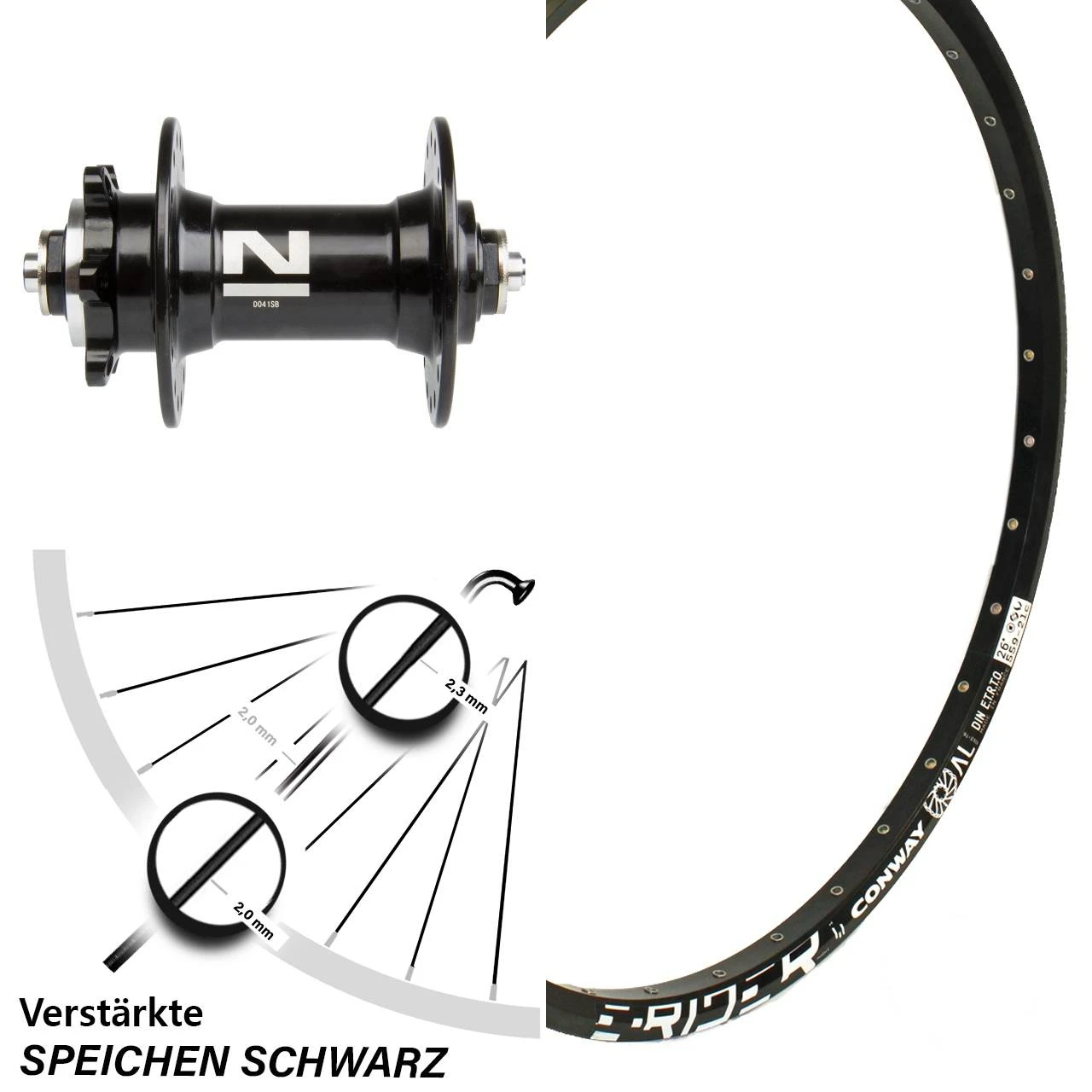 Dieses Hinterrad ist mit verstärkten Speichen, sogenannten Eindickendspeichen (auch ID oder ED genannt) bestückt. Die Speichen sind im empfindlichen und bruchgefährdeten Bogenbereich mit 2,34 mm Querschnitt besonders verstärkt ausgeführt. Die restliche Speiche weist eine Dicke von 2,0 mm auf. Dadurch kann das Laufrad insgesamt höher belastet werden, sei es durch schwere Fahrer oder mit viel Gepäck.