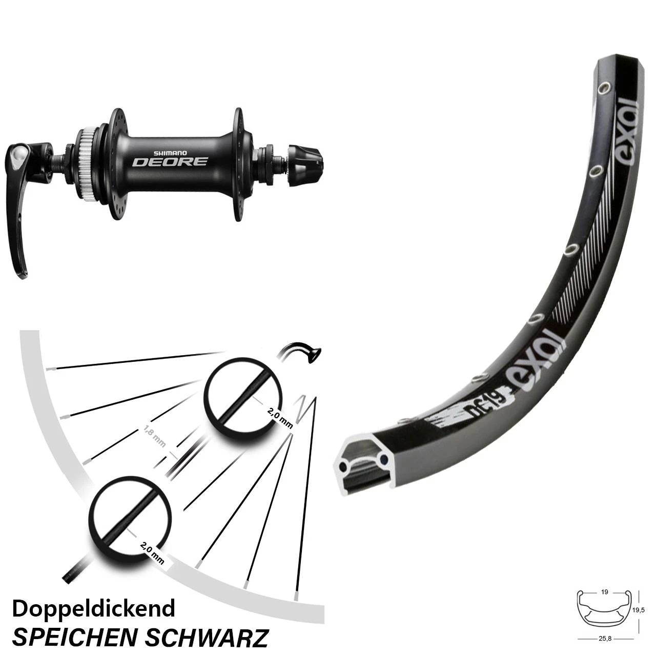 Technische Daten Vorderrad Exal DC 19 schwarz mit Nabe Shimano HB-M6000 schwarz