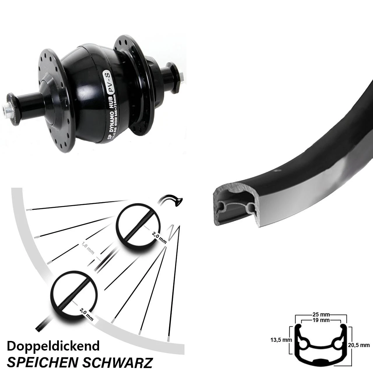 Technische Daten vorderes Laufrad Ryde Andra 30 Felgenbremse schwarz & Nabendynamo Shutter Precision PV-8 Felgenbremse schwarz