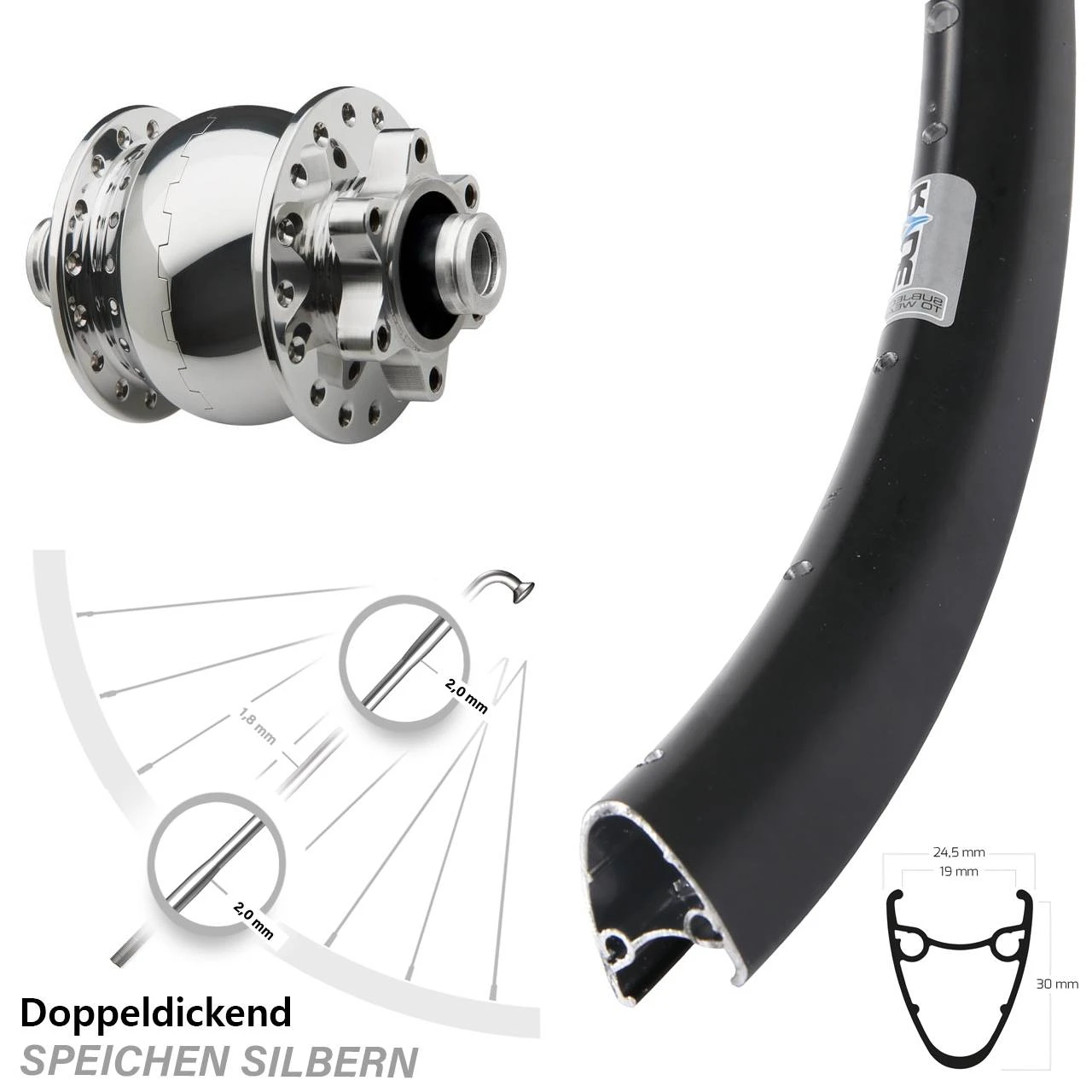 - Nabendynamo: SON 28-12 Disc 6-Loch silbern – besonders leichtläufig