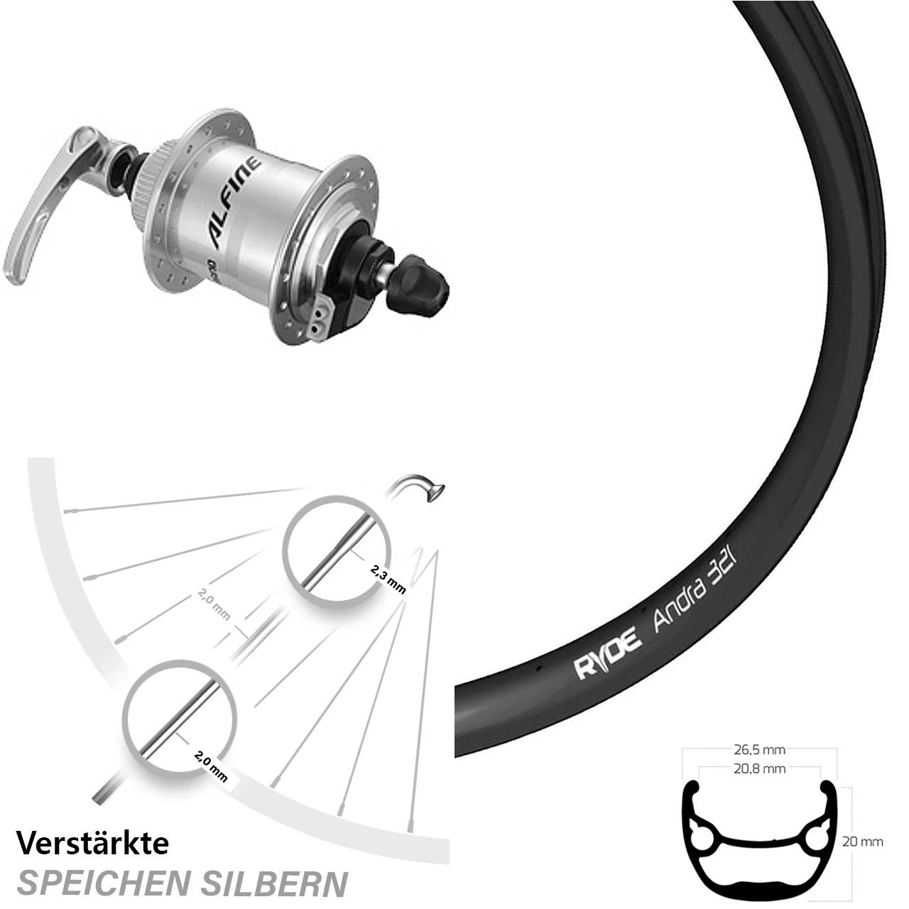 Vorderrad Fahrrad 28 Zoll Ryde Andra 321 Shimano Alfine Centerlock mit verstärkten Speichen