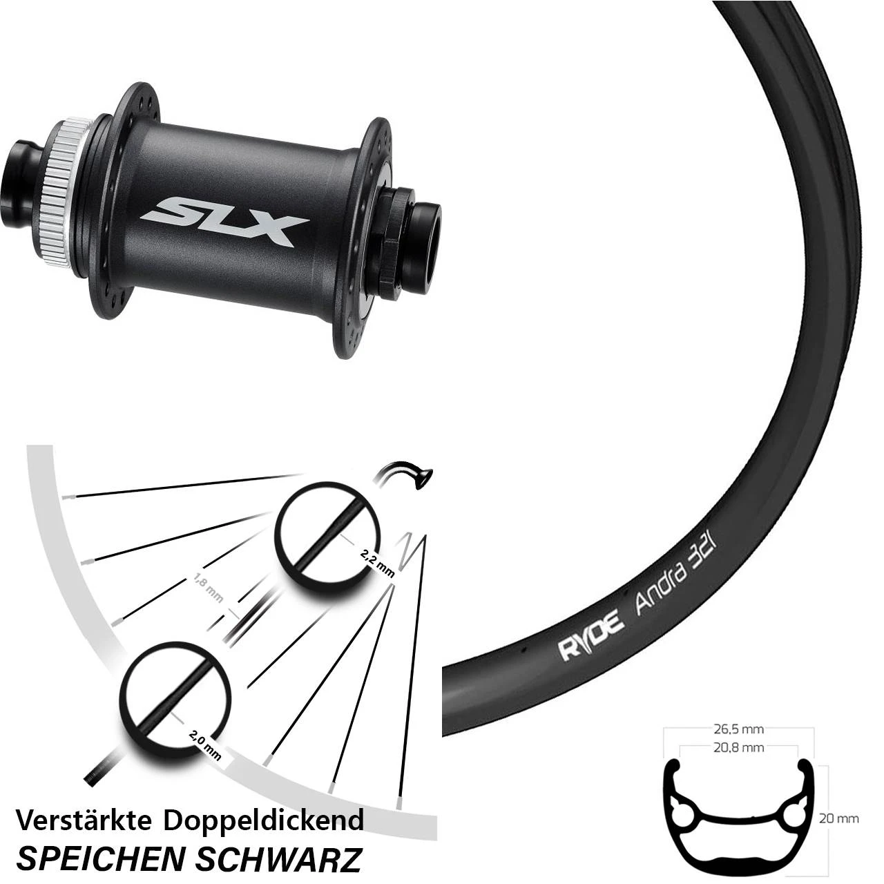 Technische Daten Vorderrad Ryde Andra 321 Disc schwarz mit Nabe Shimano SLX HB-M678 Disc schwarz Steckachse